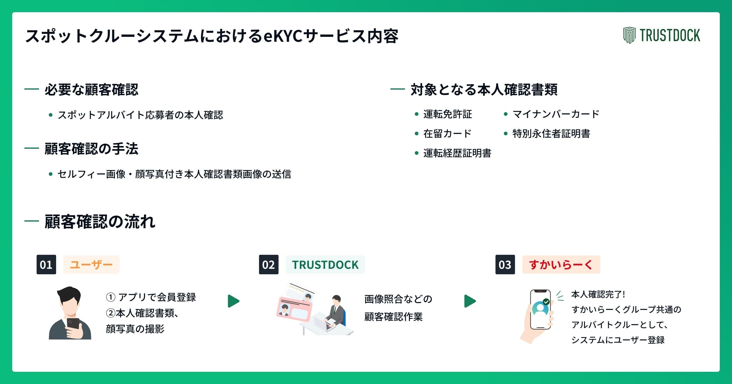 株式会社TRUSTDOCK(東京都中央区、代表取締役:千葉 孝浩、以下TRUSTDOCK)は、株式会社すかいらーくホールディングス(東京都武蔵野市、代表取締役社長COO:金谷 実、以下すかいらーく)が展開する、すかいらーくグループ店舗共通の単日アルバイト採用管理システム「スポットクルーシステム」に、eKYC(オンライン本人確認)サービス「TRUSTDOCK」の提供を開始しました。