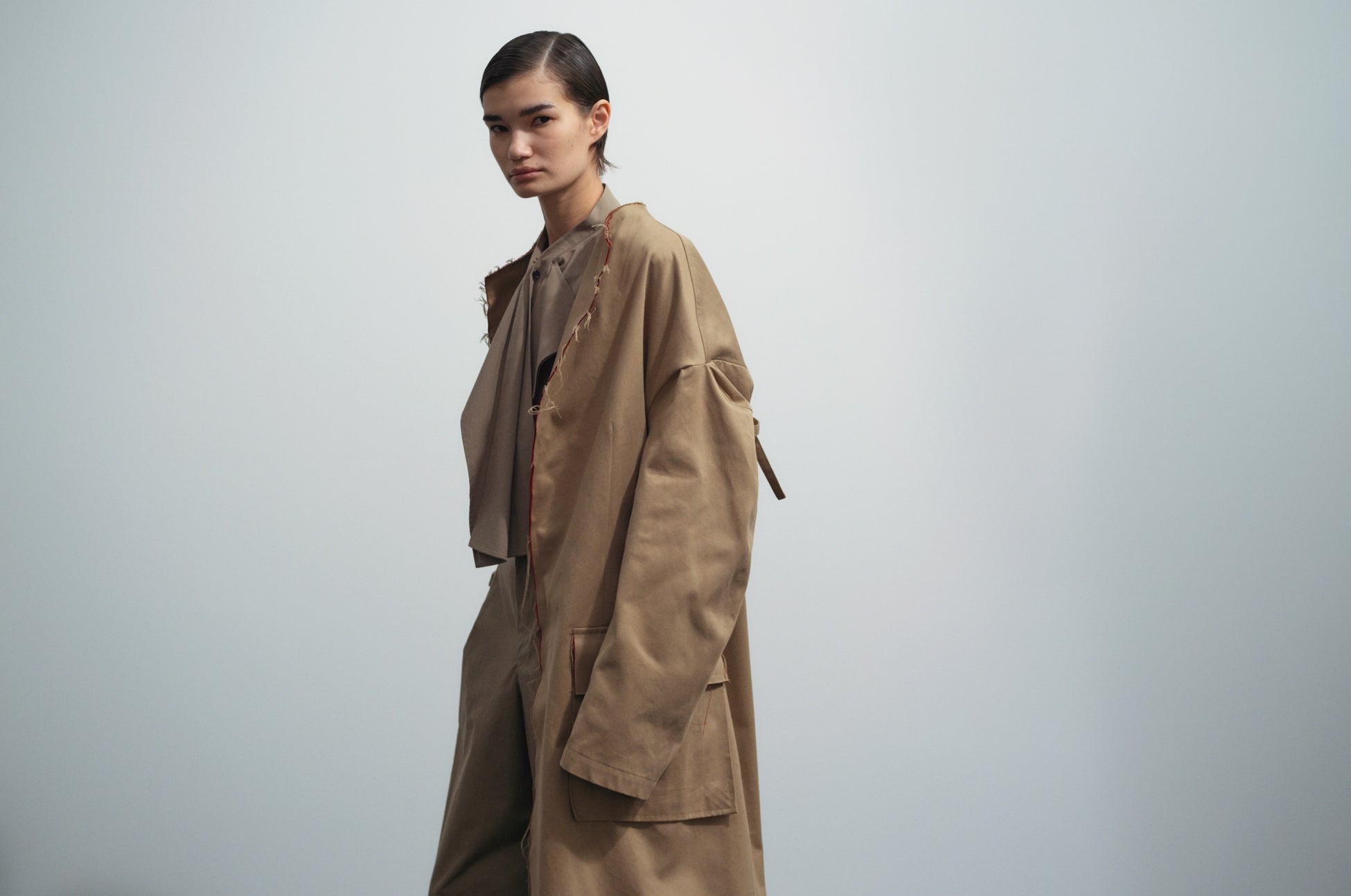 素材そのものの質感が、断ち切りで服の表情に取り入れられたコットンツイル生地──生地の断面から、赤や紫の糸が覗き、表情に動きをつけるコートやジャケット。
