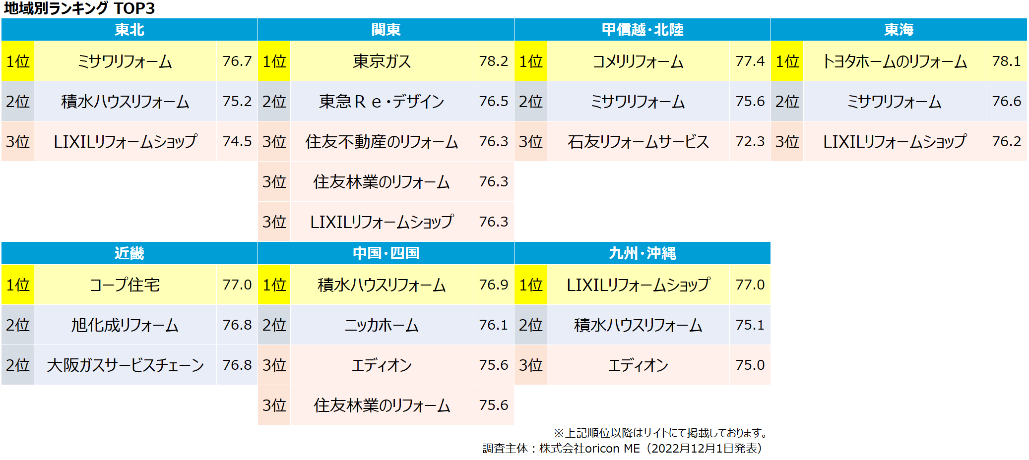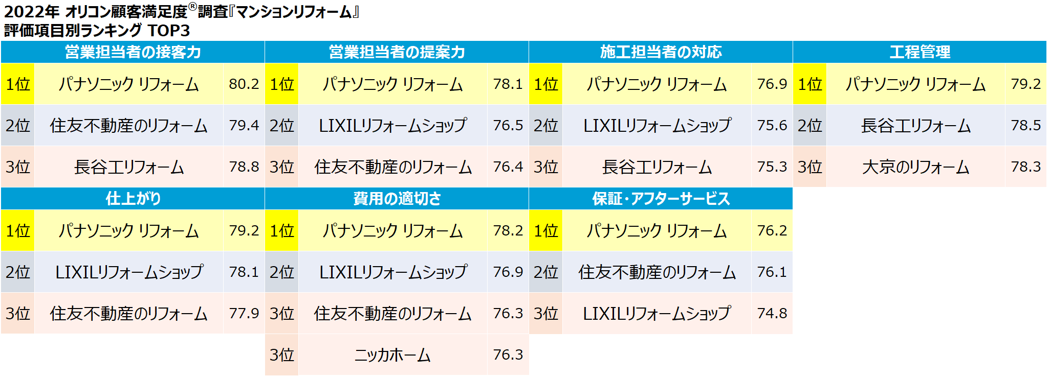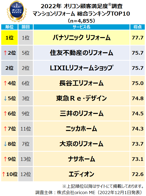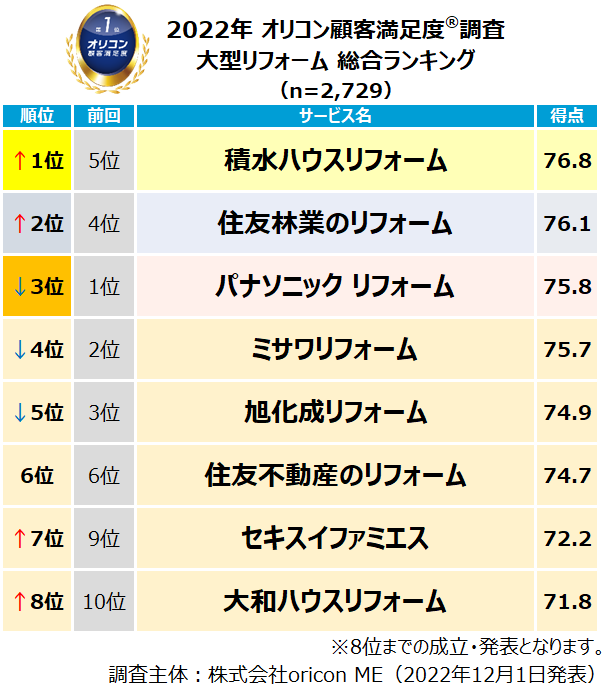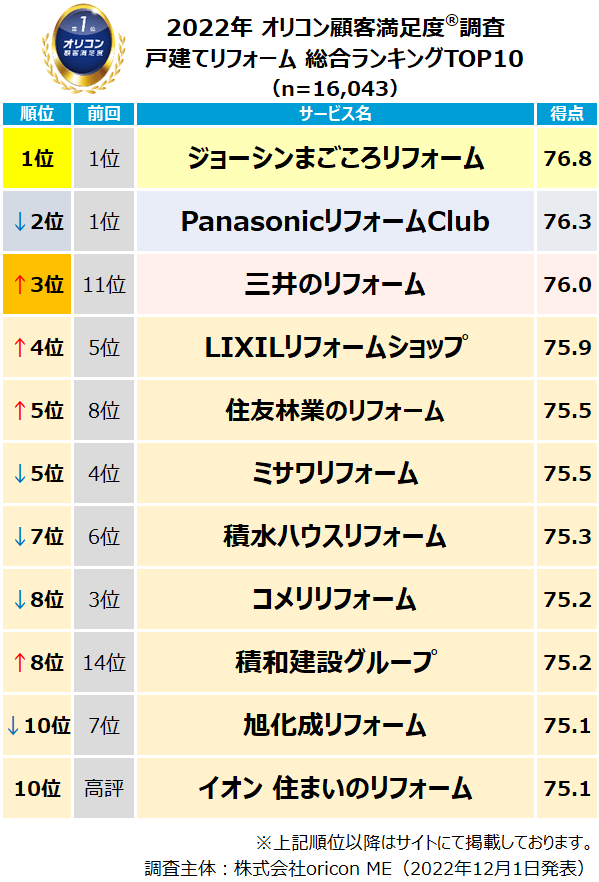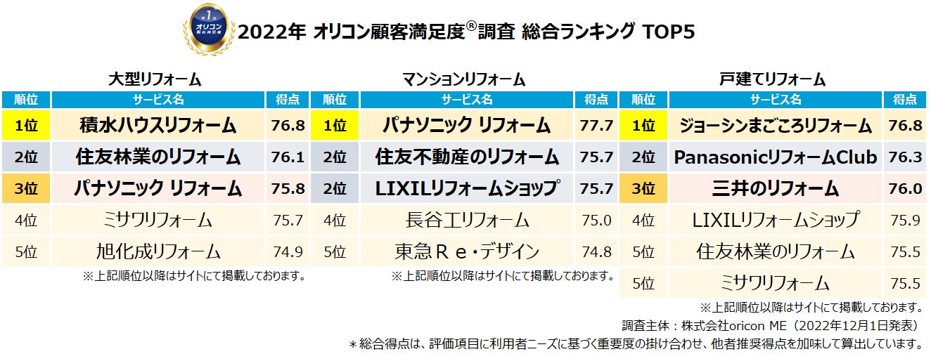 実際の利用者23,627人が回答した”リフォーム会社”ランキング(2022年 オリコン顧客満足度®調査)