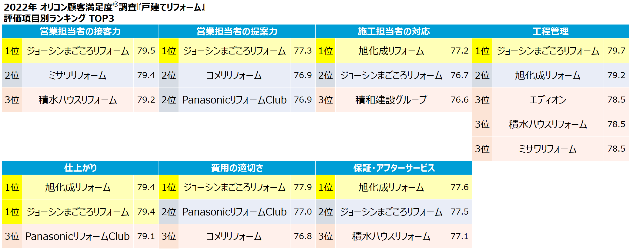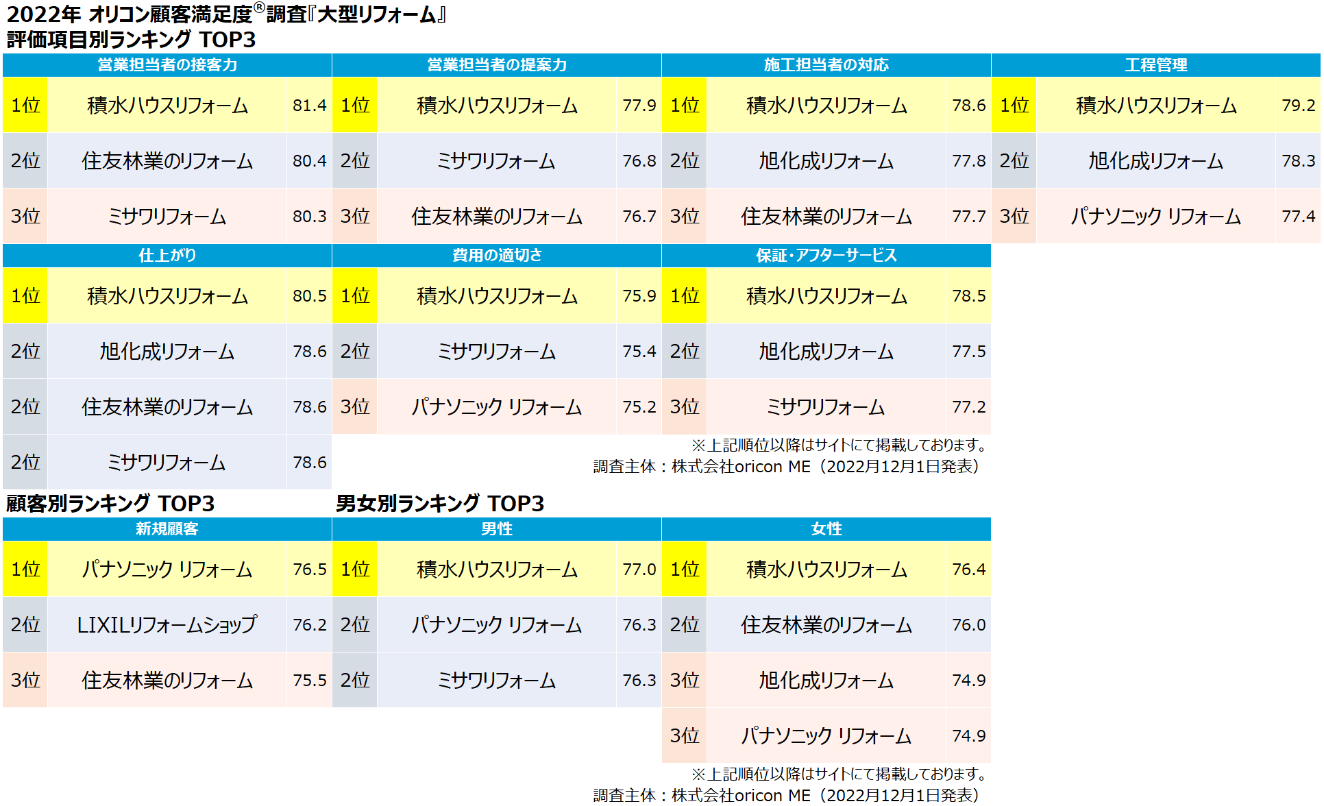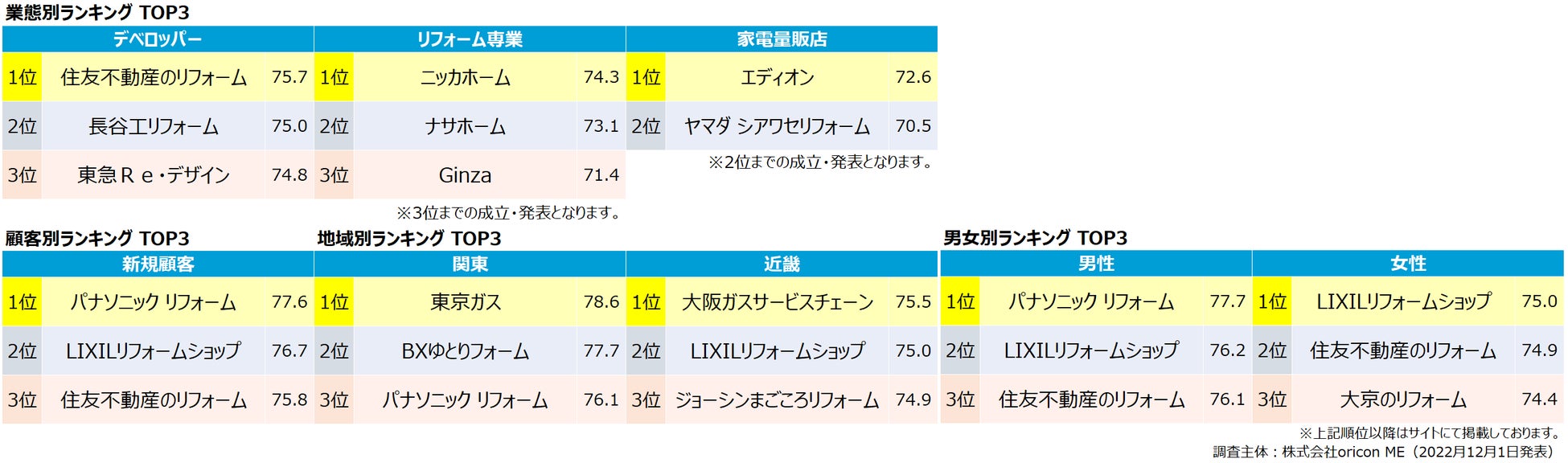 『大型リフォーム』は【積水ハウスリフォーム】、『マンションリフォーム』は【パナソニック リフォーム】、『戸建てリフォーム』は【ジョーシンまごころリフォーム】が総合1位に