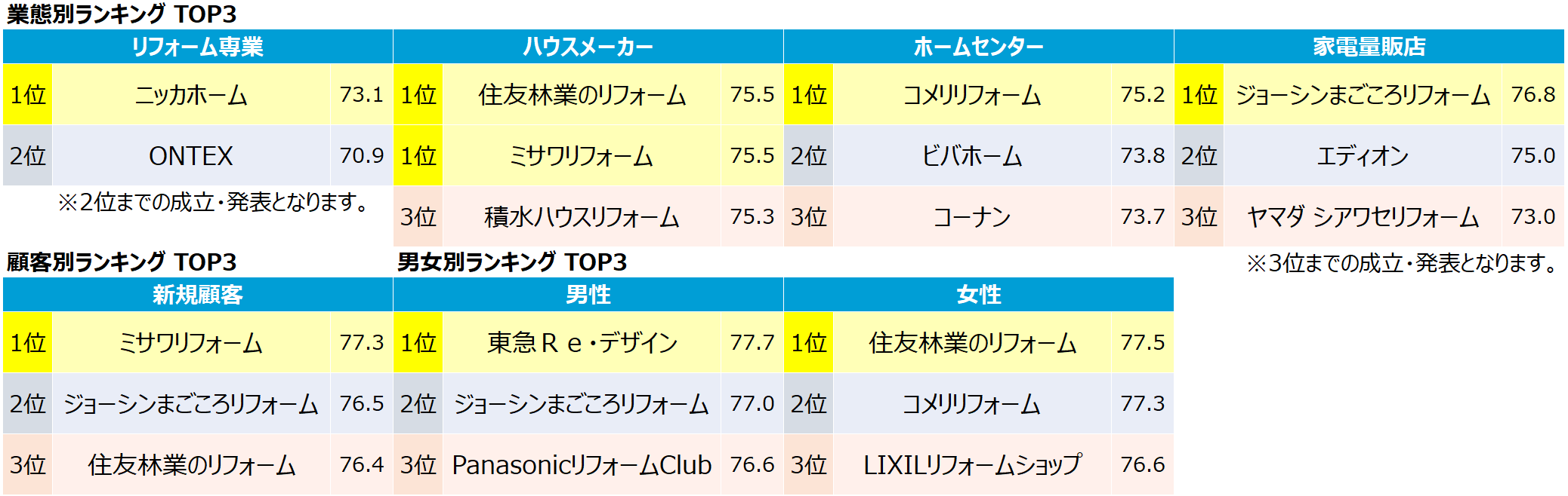 総合2位の【住友不動産のリフォーム(住友不動産株式会社 本社:東京都新宿区)】は、業態別の「デベロッパー」で1位を獲得しています。また同点で総合2位にランクインした【LIXILリフォームショップ(株式会社 LIXIL 本社:東京都品川区)】は、「女性」部門で1位となりました。