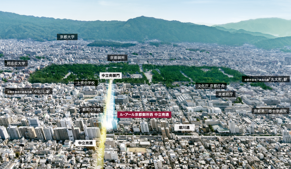 上京区・御所西の「中立売通」沿いに立地する「ル・アール京都御所西 中立売通」は、京都市営地下鉄烏丸線「今出川」駅と「丸太町」駅の2駅が利用可能であり、3LDK・2LDK+Sのファミリープランが中心で、多様なニーズに応える豊富なセレクト・カラープランをご用意しております。
