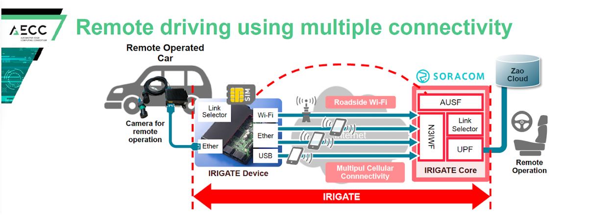 「IRIGATE」は、AECCにおいて、車のライフサイクル全体での柔軟で安定した通信の提供を目指し、自動車メーカーが中心となって開発しているコネクテッドカー向けの新しい通信プラットフォームです。クラウド上のIRIGATEコアとIRIGATE端末が接続を確立することで、認証、課金、ルーティングなど、通信事業者と同等の管理と運用を可能にします。ソラコムは、クラウド上に迅速に展開できるモバイルコアの技術を提供しています。
