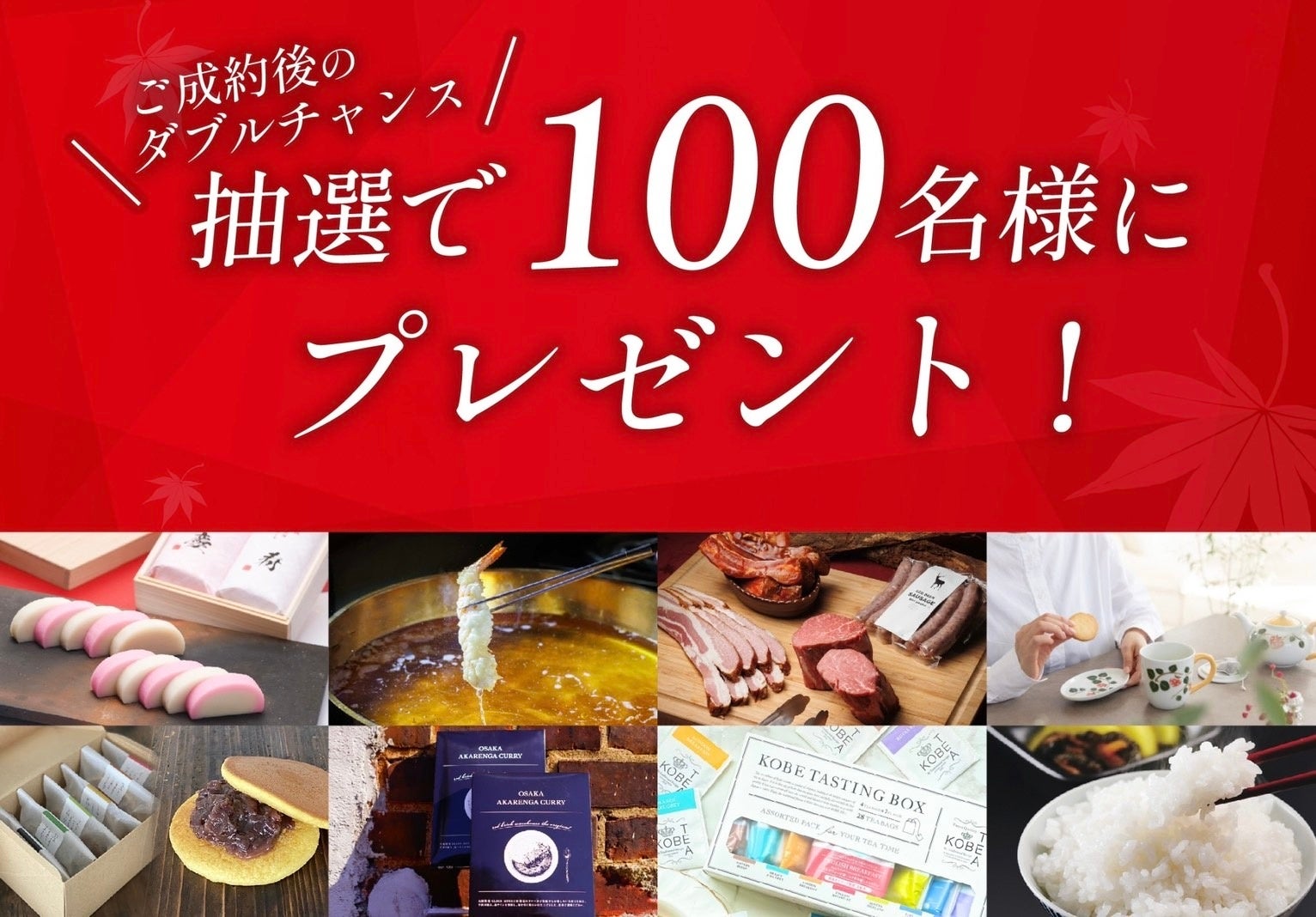 さらに、ご成約いただいたお客様の中から抽選で100名様に豪華特典をプレゼントするダブルチャンス企画を実施いたします。この機会にぜひご応募ください。