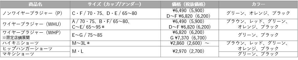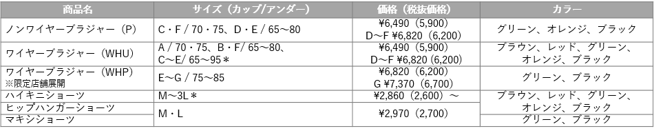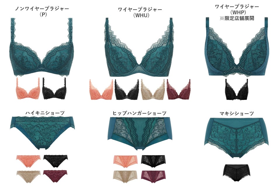 カップサイドの「エンジェルスリムシートⓇ」*1とボーン*1で、脇からしっかり寄せてスリムに魅せる人気シリーズ。ワイヤーのストレスを感じたくないならノンワイヤーブラジャー(P)、きちんと感ならワイヤーブラジャー(WHU)、そしてバストを小さくすっきり見せるならワイヤーブラジャー(WHP)*2と、選べる3タイプが揃いました。ワイヤーブラジャー(WHU)とショーツ2型は5色展開です。 *1 PとWHUのみ *2 限定店舗展開。