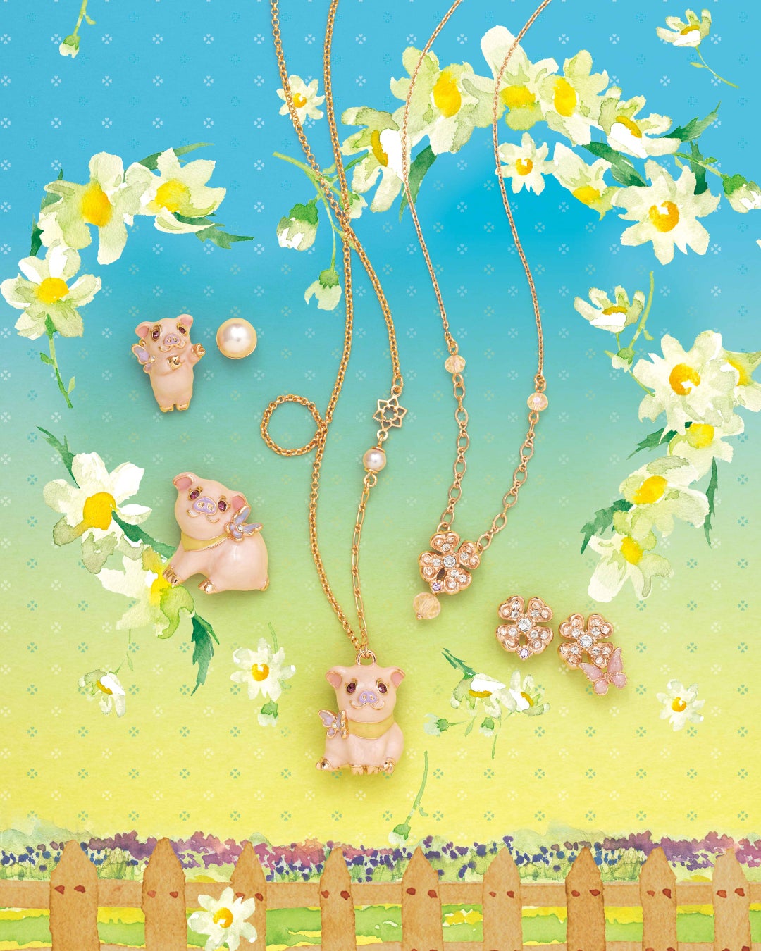 つぶらな瞳とパープルカラーの鼻がチャームポイントのミニブタモチーフは、優しいピンクカラーが癒しをもたらし、キュートなポーズと表情が楽しさをお届けします。