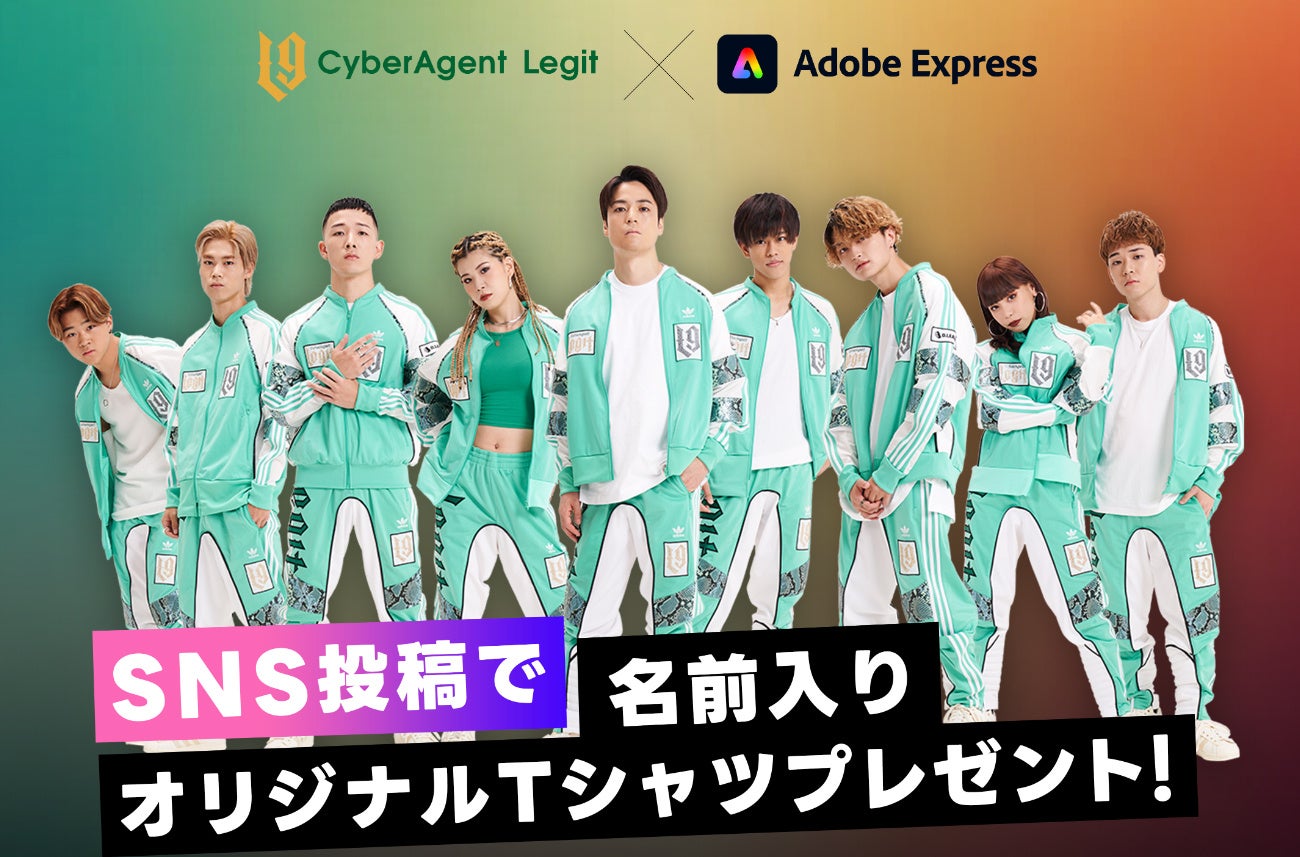コンテスト概要:Adobe Expressのテンプレートを使用して、応援メッセージを入れたSNS投稿を募集します。応募者の中から抽選で150名の方に自分の名前が入ったCyberAgent LegitオリジナルTシャツをプレゼント。