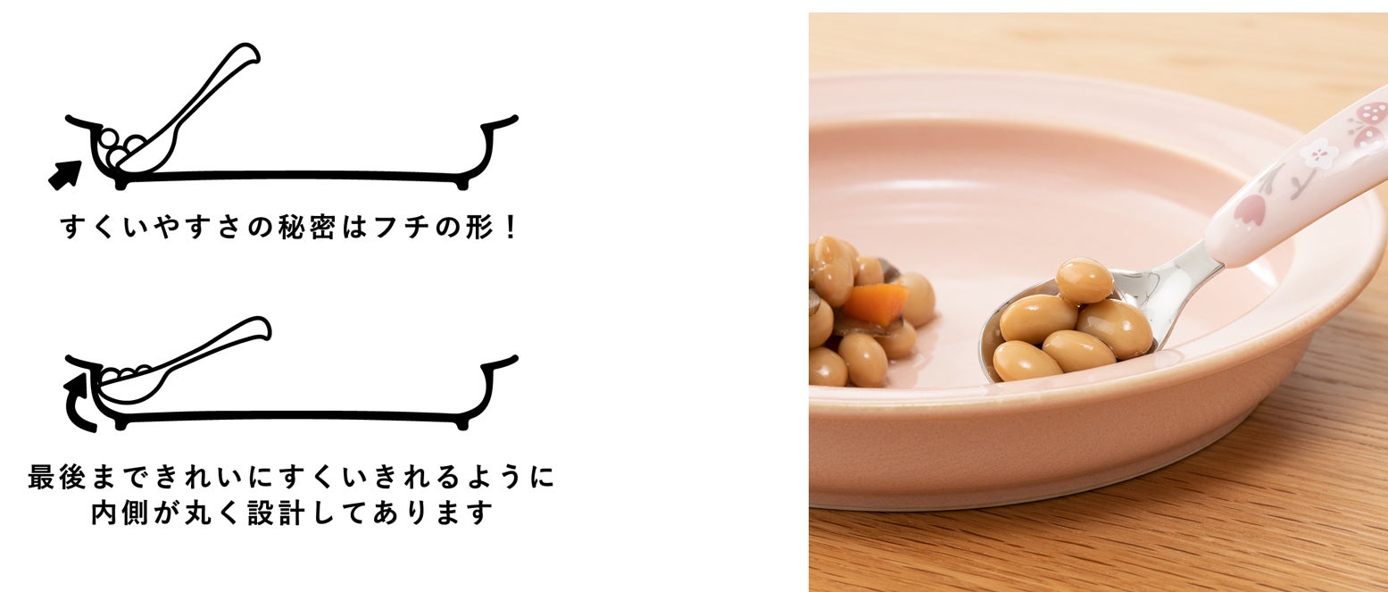 グッドデザイン賞を受賞した(株)山加商店のユニバーサル多用深皿という食器形状を採用。内側面にカーブをつけることで、最後まで簡単にすくうことができます。また、重さがあるので、使っている最中もプレートがずれにくく、使いやすいのもポイントです。お子様だけでなく、介護中のご家族もお使いいただけるので、さまざまなシーンで活躍します。