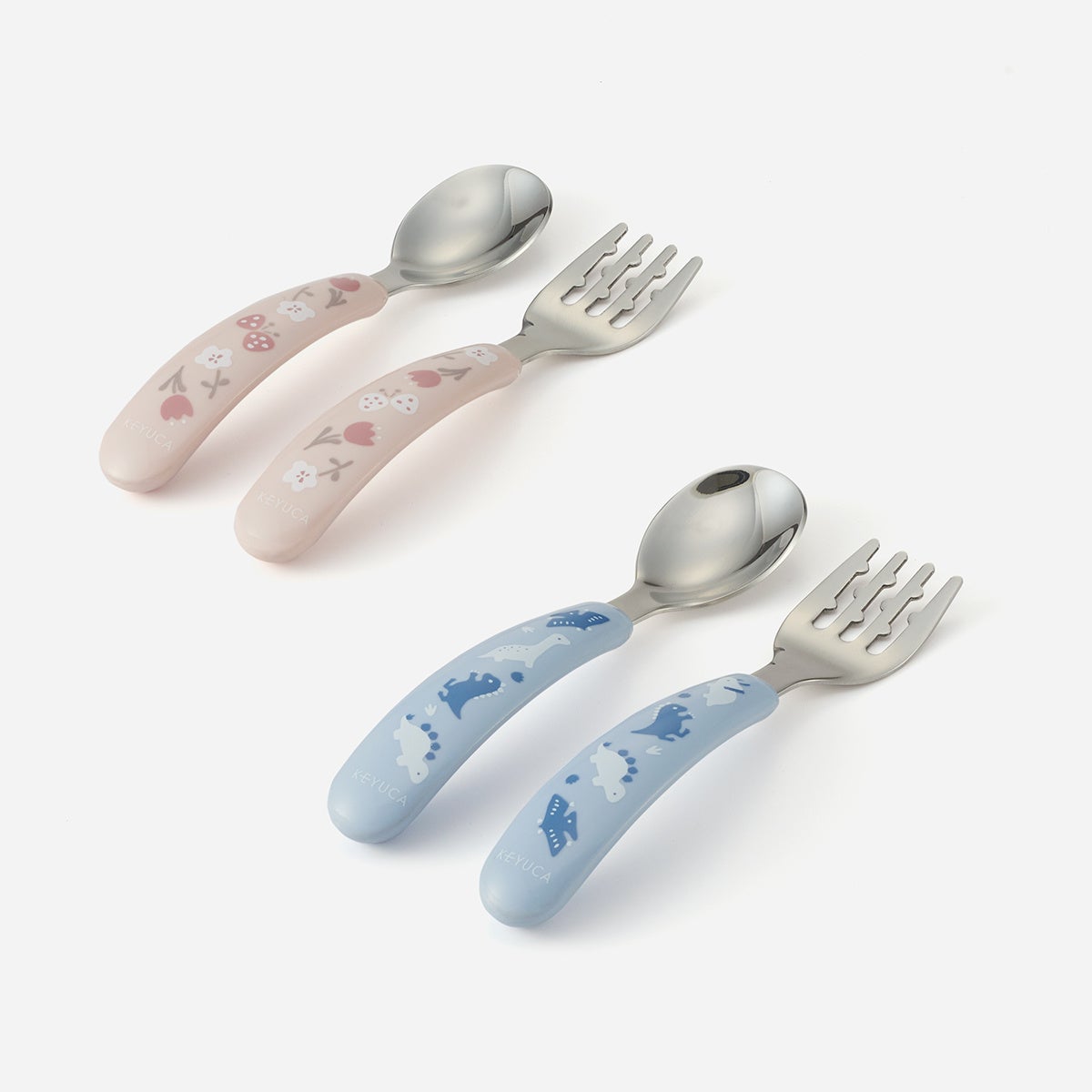 はじめてスプーンやフォークを使う子どもにおすすめの握りやすいフォークとスプーンのセットです。にぎりやすいように、柄の部分を太めに設計。スプーンやフォークの先の部分は薄いステンレス製にすることで、食べ物を救ったり、さしたりしやすいような仕様になっております。また、麺類が落ちにくいよう、フォークの先は凸凹形状です。
