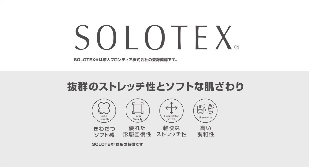 SOLOTEX®とは、帝人フロンティア株式会社が開発した、ソフトな触り心地や高いストレッチ性、美しいシルエットを保つ形態回復性などを特徴とする新しい繊維素材で、高い機能性から衣料品をはじめとする様々な商品に使用されており、TIGORAはこの優れた素材をスウェットシリーズに初採用した上で、お求めやすいプライスを実現しました。