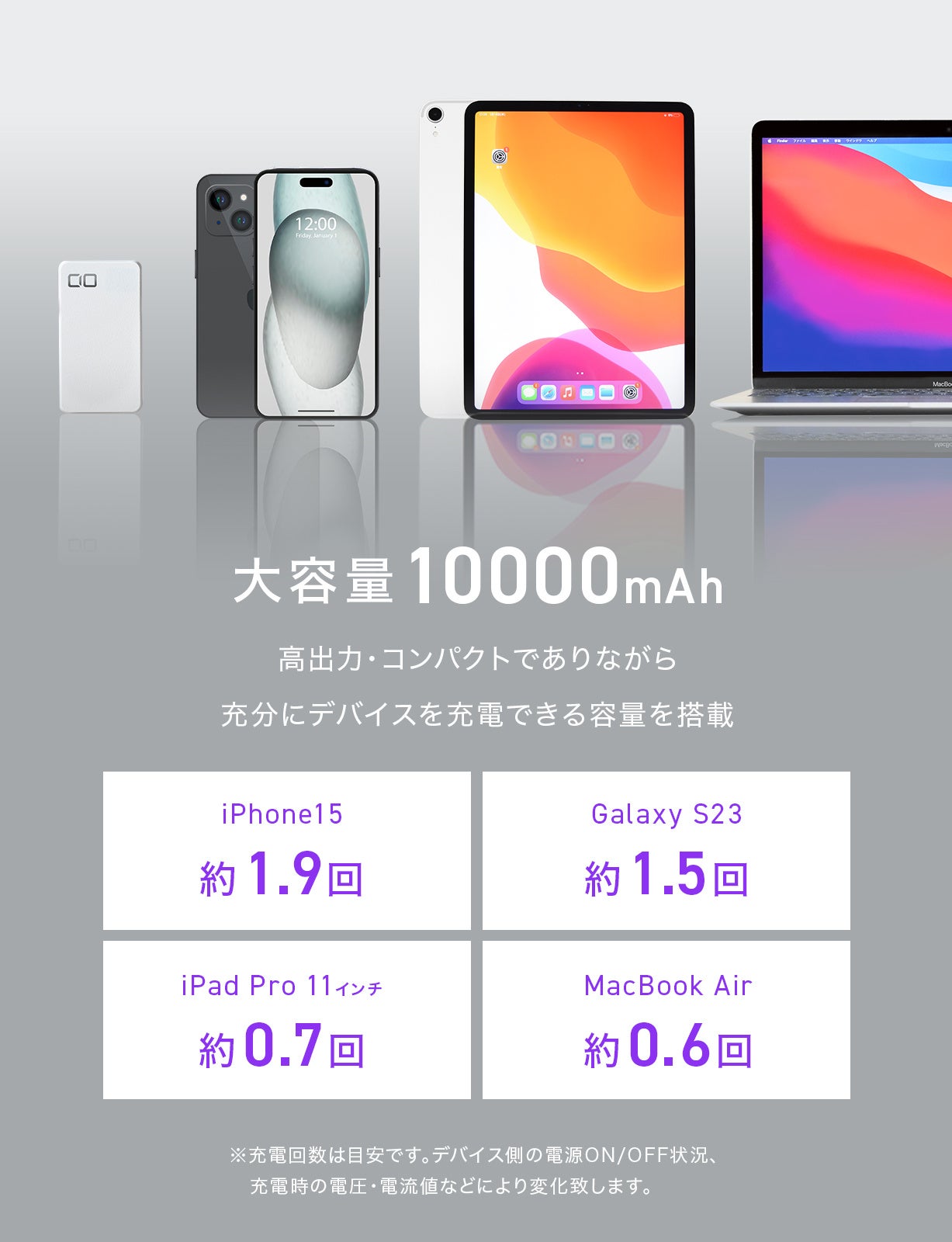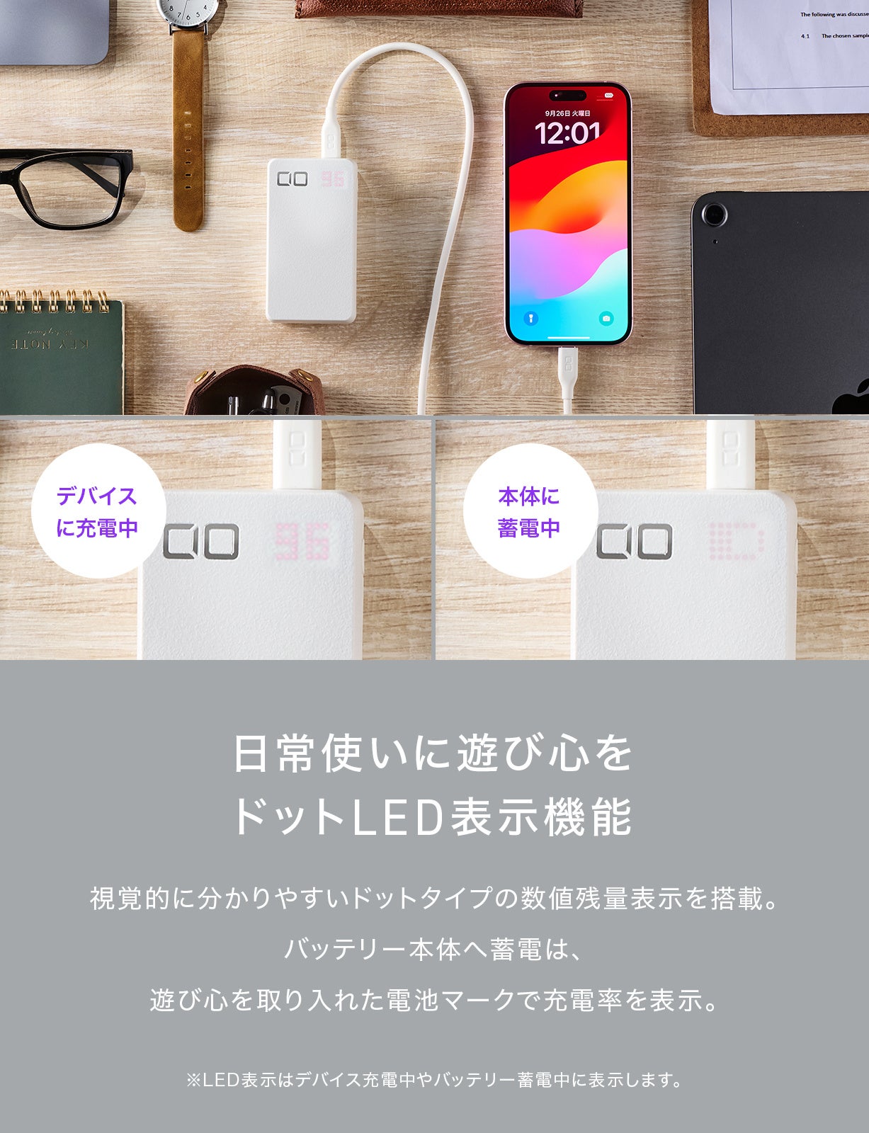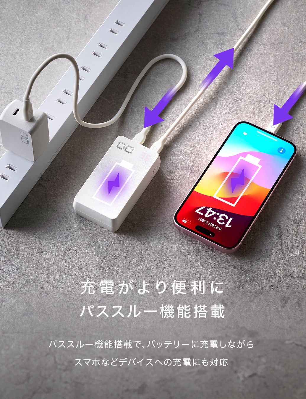 モバイルバッテリーの充電し忘れで、使いたい時にバッテリーが空になっている事も。本製品は画期的な急速パススルー充電機能を搭載しており、デバイス、モバイルバッテリー、両方の残量が少なくなってもバッテリーを経由しながら急速充電が可能です。コンセントが1つしかない環境や、両方を充電したときに重宝します。