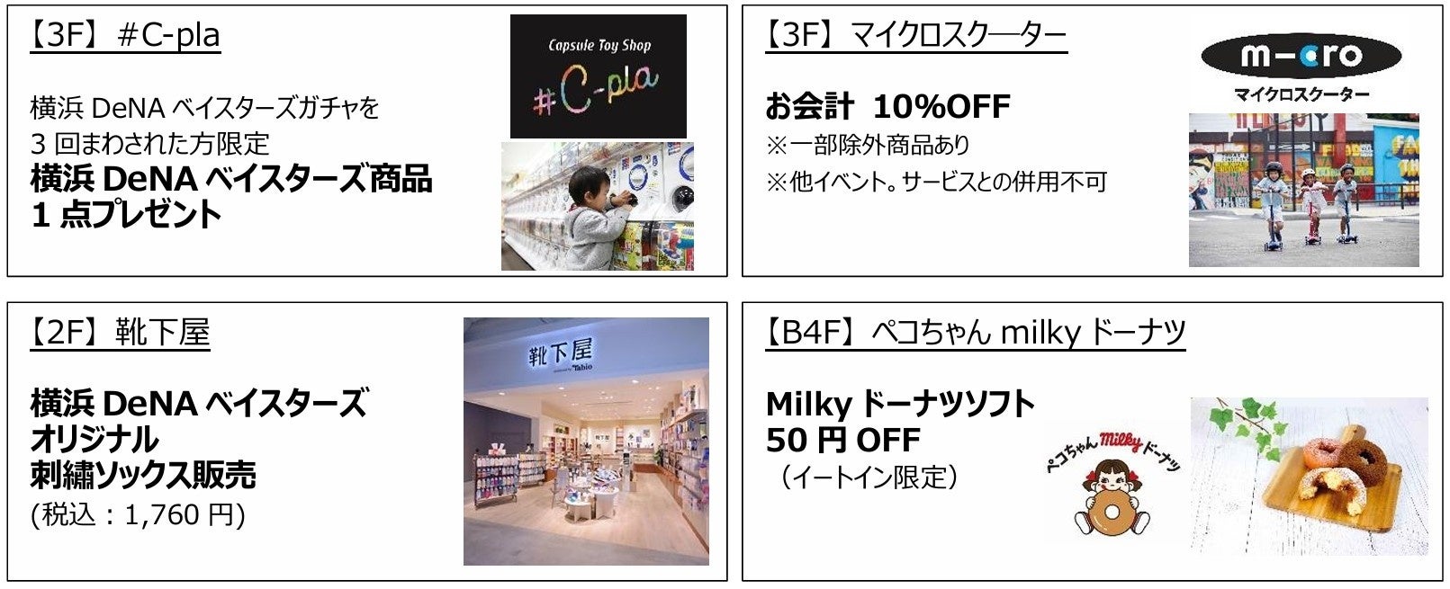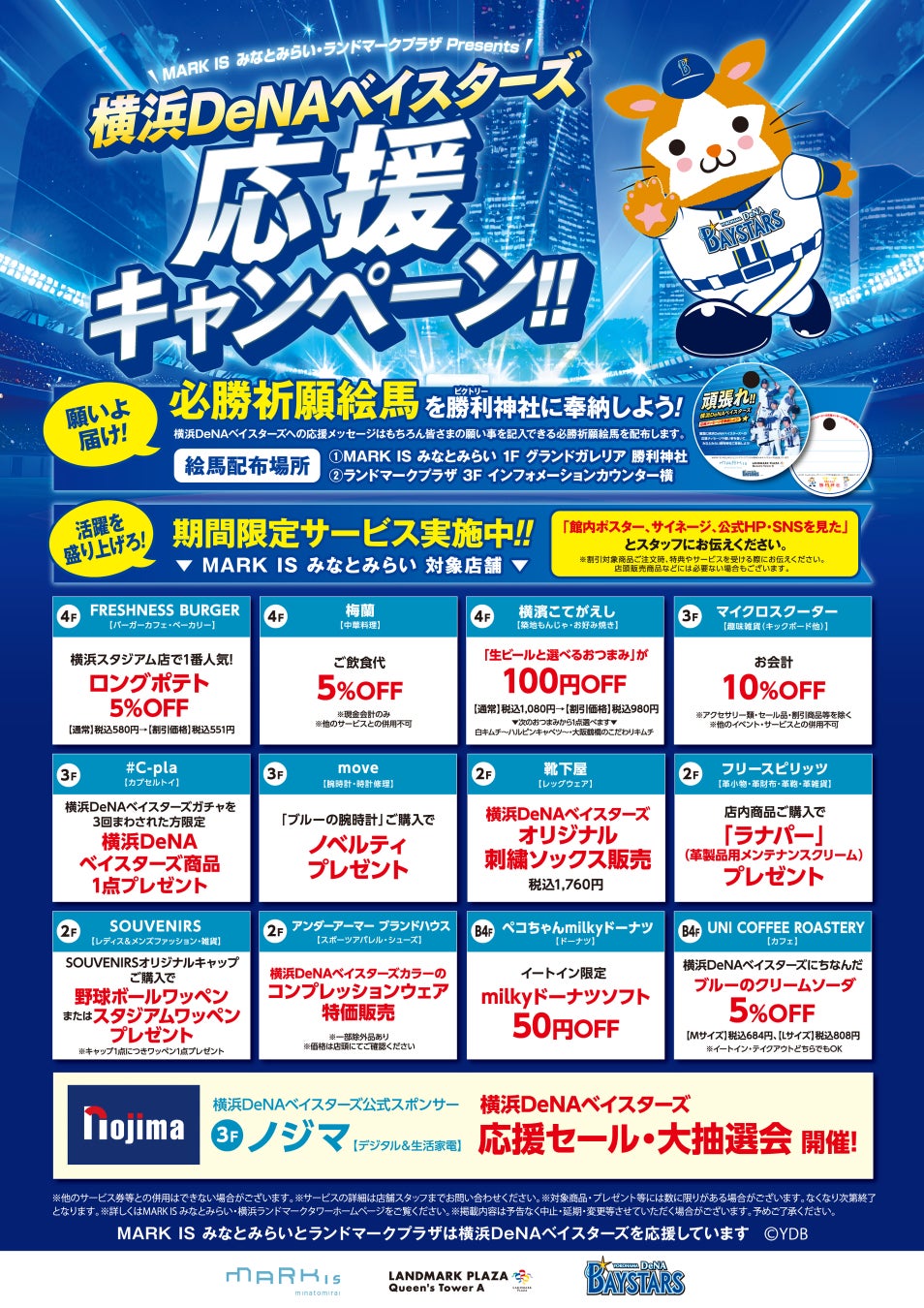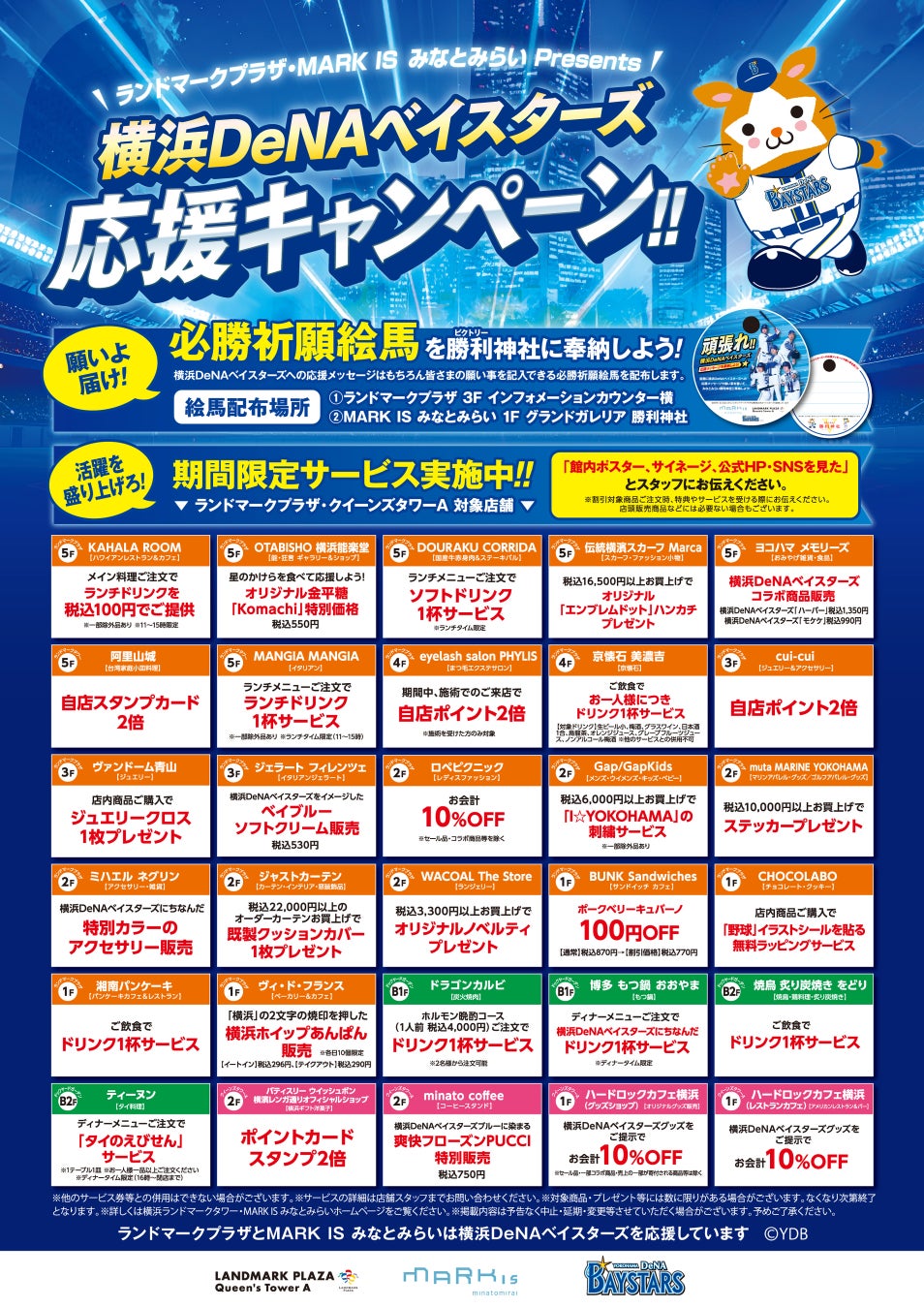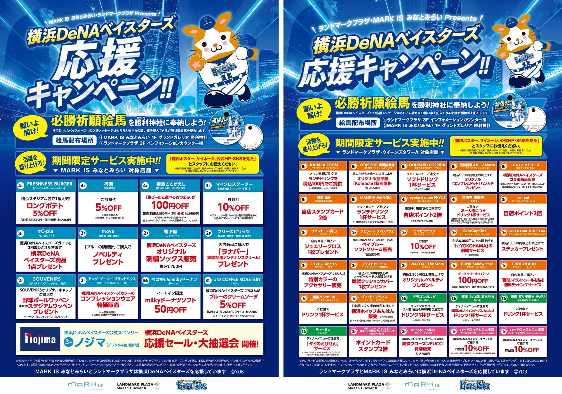 「横浜DeNAベイスターズ 応援キャンペーン」では、最大10%OFFの割引や、横浜DeNAベイスターズ関連のノベルティプレゼント、限定商品の発売などを行います。今年は、昨年の「横浜DeNAベイスターズ感動をありがとうキャンペーン」よりも参加店舗数を増やし、両施設で合計43店舗(MARK IS みなとみらい:13店舗、ランドマークプラザ:30店舗)で、より一層、横浜・みなとみらいエリアを盛り上げてまいります。