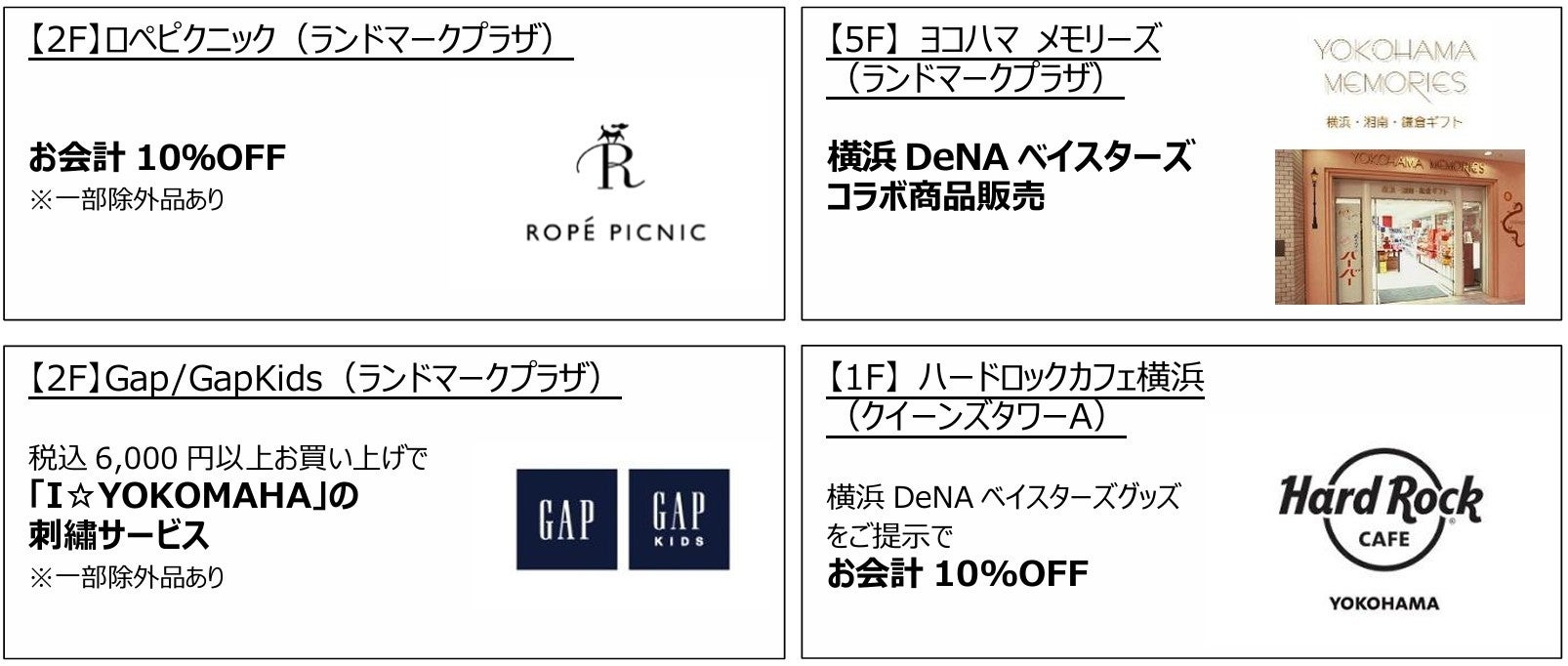 10月11日(土)より、2施設合同で「横浜DeNAベイスターズ 応援キャンペーン」 期間限定サービスを実施いたします。食物販から、レディス、メンズ、キッズウェア、ファッション雑貨、インテリア雑貨まで両施設 合計43店舗(MARK IS みなとみらい:13店舗、ランドマークプラザ:30店舗)でサービス予定です。最大10%OFFの割引やノベルティプレゼント、特典などのお得な体験ができるキャンペーンです。参加ショップや特典内容の詳細については、各施設のホームページにてご確認ください。
