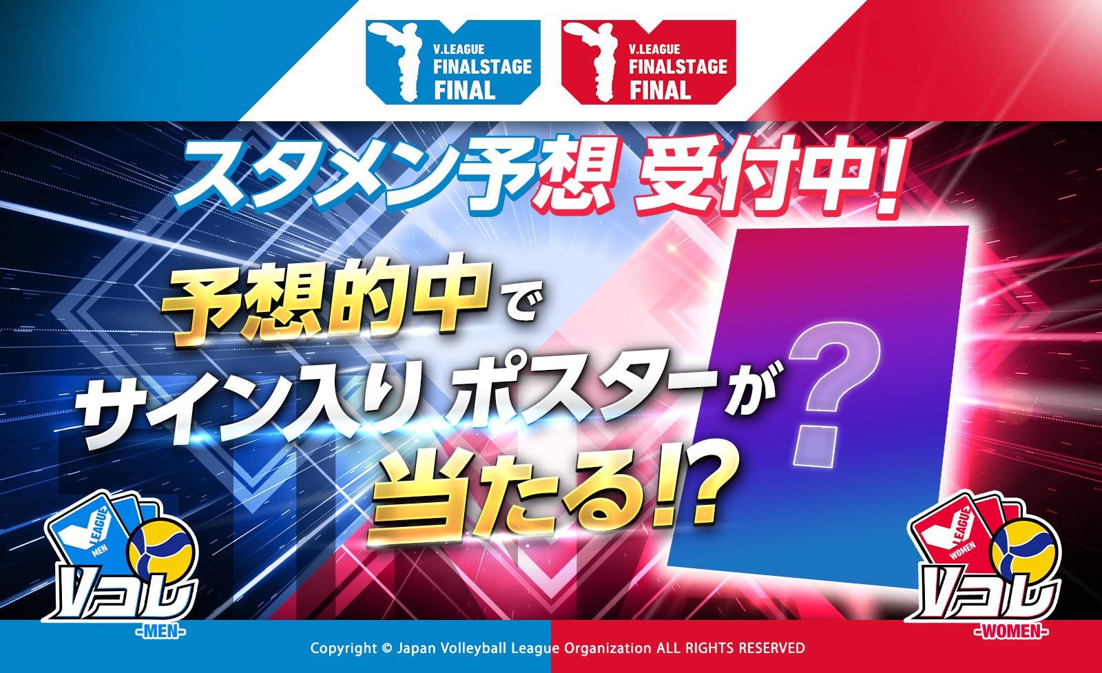 ファイナル第1セット目の両チームスターティングメンバーを予想し、見事全選手を的中した方の中から抽選で、選手直筆サイン入りオリジナルポスターをプレゼントいたします。(MEN・WOMENで各3名)