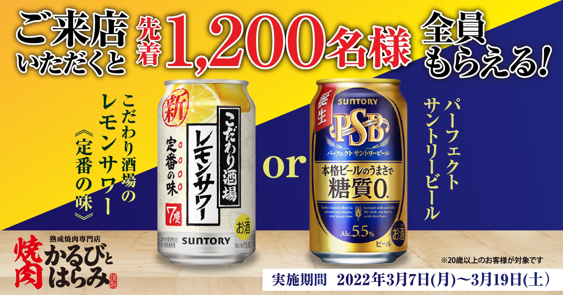 株式会社物語コーポレーション(本社:愛知県豊橋市/代表取締役社長:加藤 央之)が運営する『焼肉 かるびとはらみ』(埼玉県ふじみ野市)は、2022年3月7日(月)より、店内でご飲食いただいた先着1,200名のお客様に、ご自宅でお楽しみいただけるお酒をプレゼントをいたします。
