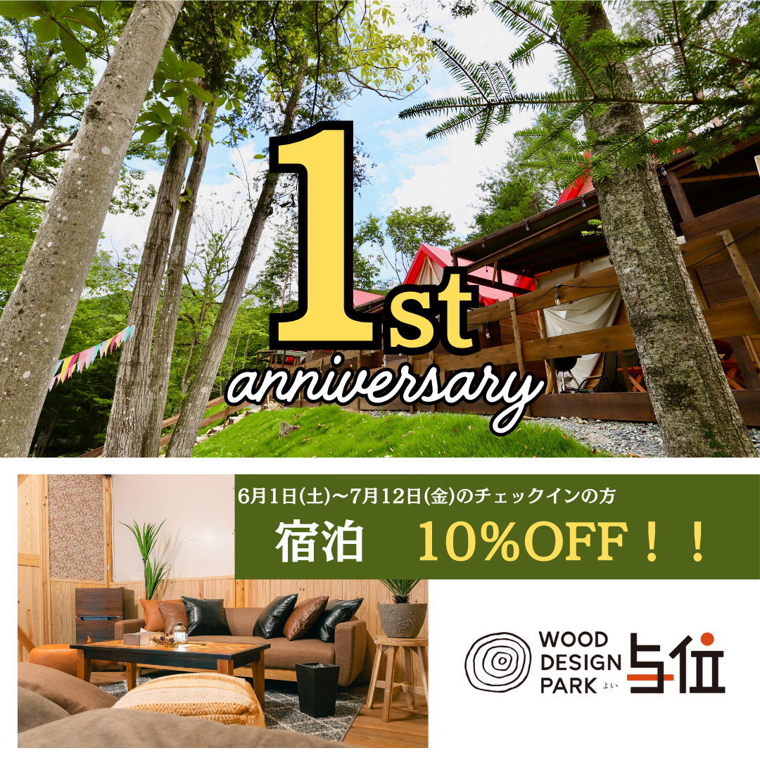 【予約者全員10%OFF】お得に宿泊できるウッドデザインパーク与位1周年記念キャンペーン開催中!!