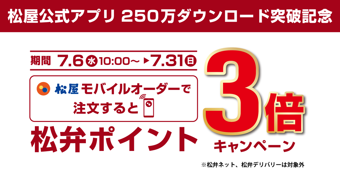 【松屋フーズ】松屋公式アプリ250万ダウンロード突破記念!「松屋モバイルオーダー付与ポイント3倍キャンペーン」開催