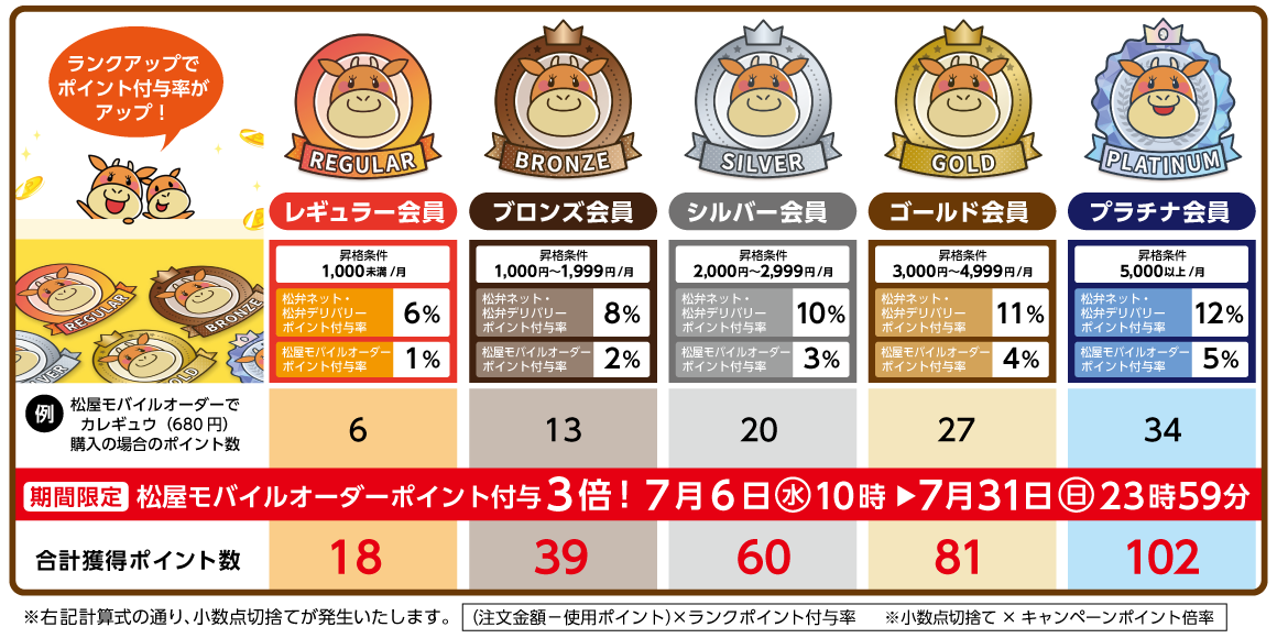 このたび松屋フーズ(本社:東京都武蔵野市、代表取締役社長:瓦葺一利)では、牛めし・カレー・定食・その他丼の「松屋」、とんかつ専門店の「松のや・松乃家」、カレー専門店の「マイカリー食堂」におきまして、券売機を使わずスマホで簡単キャッシュレス決済“松屋モバイルオーダー”にて導入いたしております松弁ポイントの「付与ポイント3倍キャンペーン」を7月6日(水)~7月31日(日)までの期間限定で開催いたします。