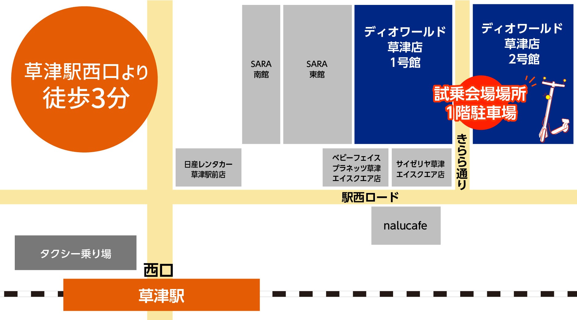 試乗の受付は、「ディオワールド2号館1階駐車場」にて⾏います。試乗同意書へのご署名と、ヘルメットの着⽤をお願い致します。 また、感染症対策として検温・消毒、ヘルメットを着⽤時はメッシュキャップとビニール⼿袋着⽤のご協⼒をお願い致します。なお、試乗の待機列の定員を超えた場合は、整理券を配布致します。予めご了承ください。ご試乗頂いた電動キックボードと電動バランスボードは、1階「ディオワールド2号館サイクルセンター」にてご購⼊いただけます。