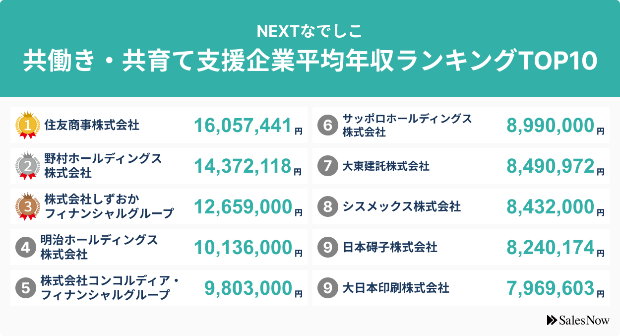 "共働き・共育てを可能にする男女問わない両立支援"が特に優れた上場企業「Nextなでしこ 共働き・共育て支援企業」の平均年収ランキングTOP10を発表!/SalesNow DBレポート