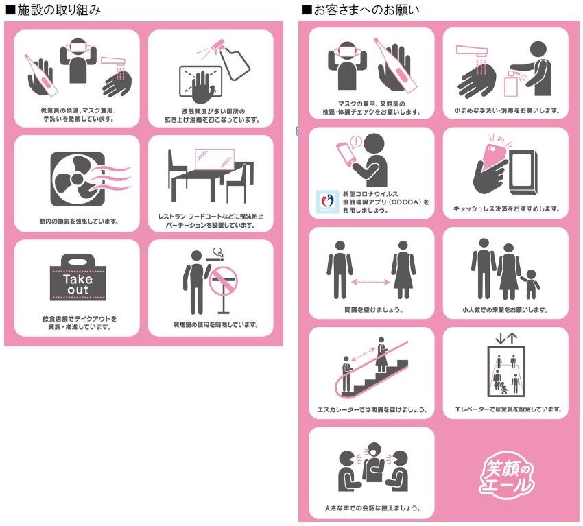 三井不動産グループが運営する商業施設では、新型コロナウイルス感染拡大防止のため下記をはじめとした様々な取り組みを実施しております。