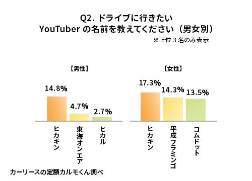 ■【男女別】ドライブに行きたいYouTuber1位のヒカキンは男女問わず人気。2位3位では男女別で特色も
