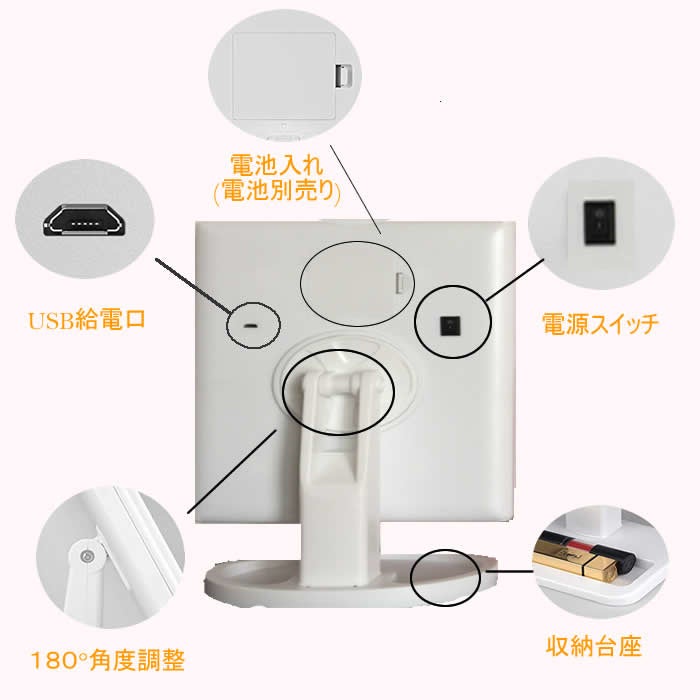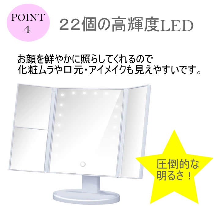 ・高輝度LEDライト搭載 中央の鏡の両サイドに高輝度LEDライトが22個搭載されているので暗い場所でもしっかりと映し出してくれます。