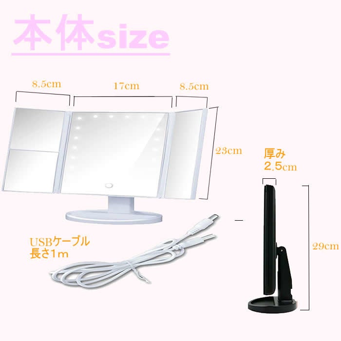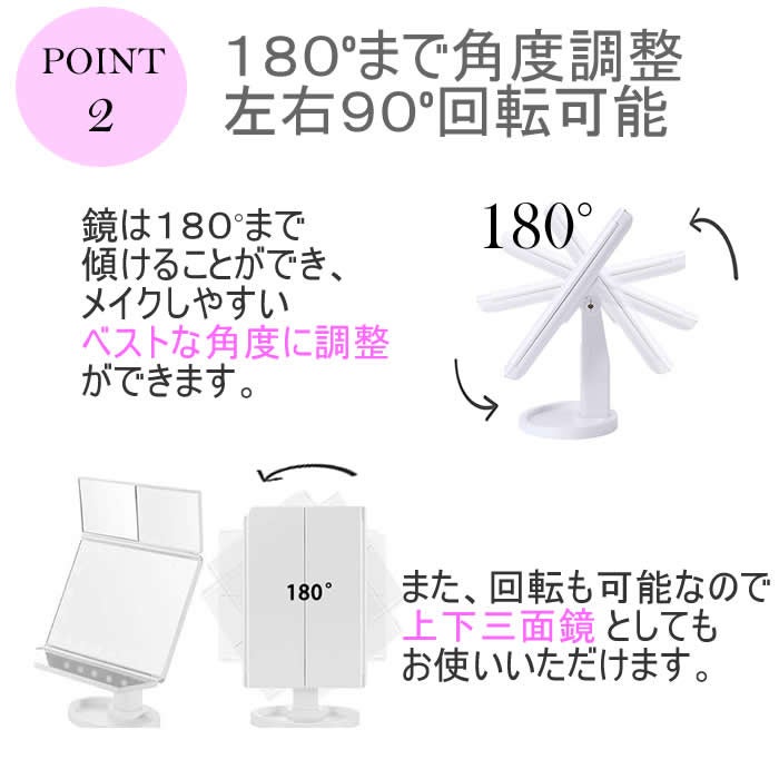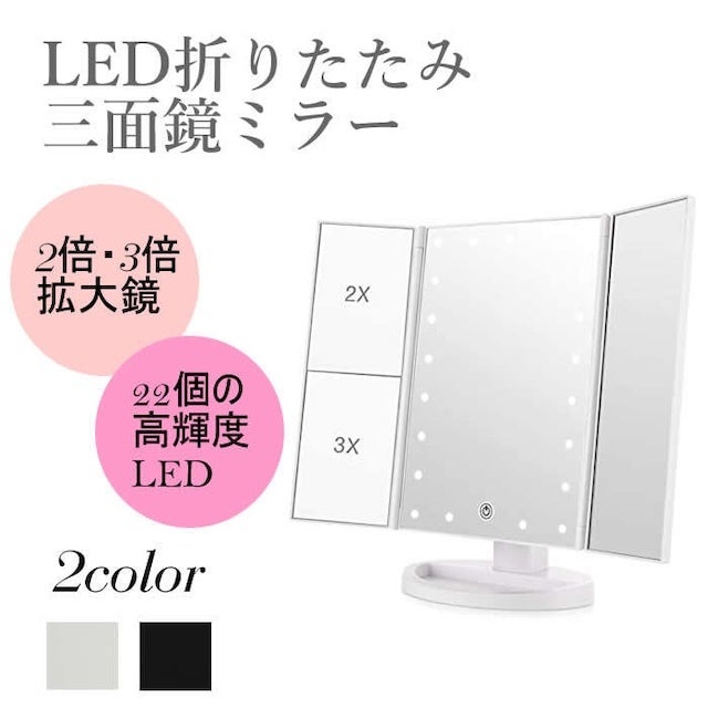 LEDブライトミラー 女優ミラー 三面鏡タイプ LEDライト22灯三面鏡 折りたたみ式 角度調整 化粧鏡 LEDミラー 大鏡 多照明モード 化粧ミラー 鏡 LEDライト付き 折りたたみ 卓上 360度回転【gi-MR-001】