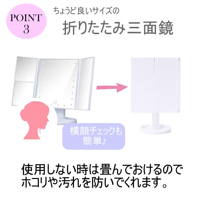 ・2倍・3倍の三面鏡搭載で、メイク、スキンケア、アイラインのズレ、毛穴の状態もしっかりチェックできます。