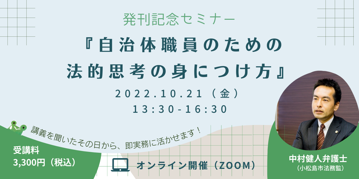 『問題解決力があがる 自治体職員のための法的思考の身につけ方 ―課長、ウシガエルを薬殺したいという住民の方からお電話です!』を2022年10月5日に発刊いたします。発刊を記念し、著者である中村 健人弁護士(小松島市法務監)による法的思考の身につけ方オンラインセミナーを開催いたします。