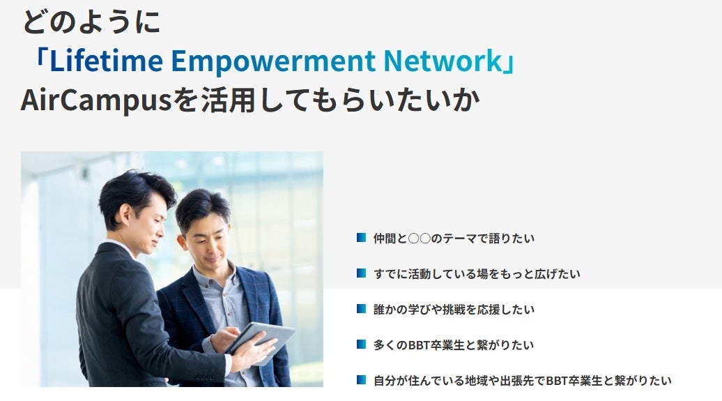 LENを通じて、世代や立場を超えて再びつながり、知見を共有し、新たなイノベーションを創出することで、Aoba-BBTは「生涯にわたり自己をアップデートし続ける」環境を整備します。これからも教育の未来に貢献し、社会全体の持続的な発展に寄与してまいります。