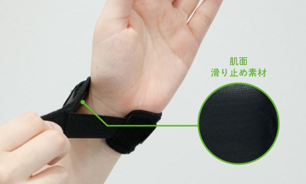 現行品には、片手での着用が難しいという課題がありました。そこで、ゴムベルト付きの輪っか状に変更したことで、本体に手を通した後、片手でも簡単に装着できるようになりました。さらに、肌が触れる面全体に滑り止め素材を使用しているため、着用時のフィット感が持続し、サポート機能を長時間キープします。