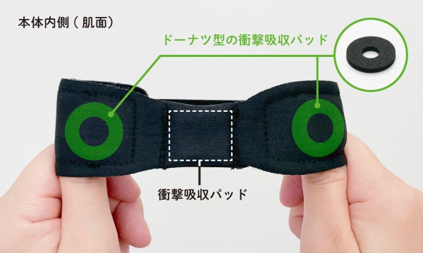 3つの特殊形状パッドを内蔵し、手首の形状にしっかりとフィットします。左右のドーナツ型パッドは手首への衝撃を吸収し、安定性を高めます。