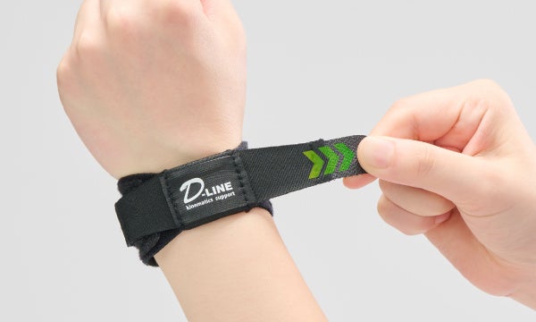 手首を曲げたり伸ばしたり、回したりする動作は、肘から伸びる筋肉によって支えられています。繰り返しかかる手首への衝撃や使いすぎによる負荷は、手首だけでなく肘や肩、首の負担にもなります。「D-LINEリストコントロール」は、手の動きの起点となる手首の腱を適度に圧迫することで、衝撃をソフトに吸収します。また、補助ベルトの引っ張り具合を調整することで、さまざまな競技や目的に応じて手首をサポートすることができます。