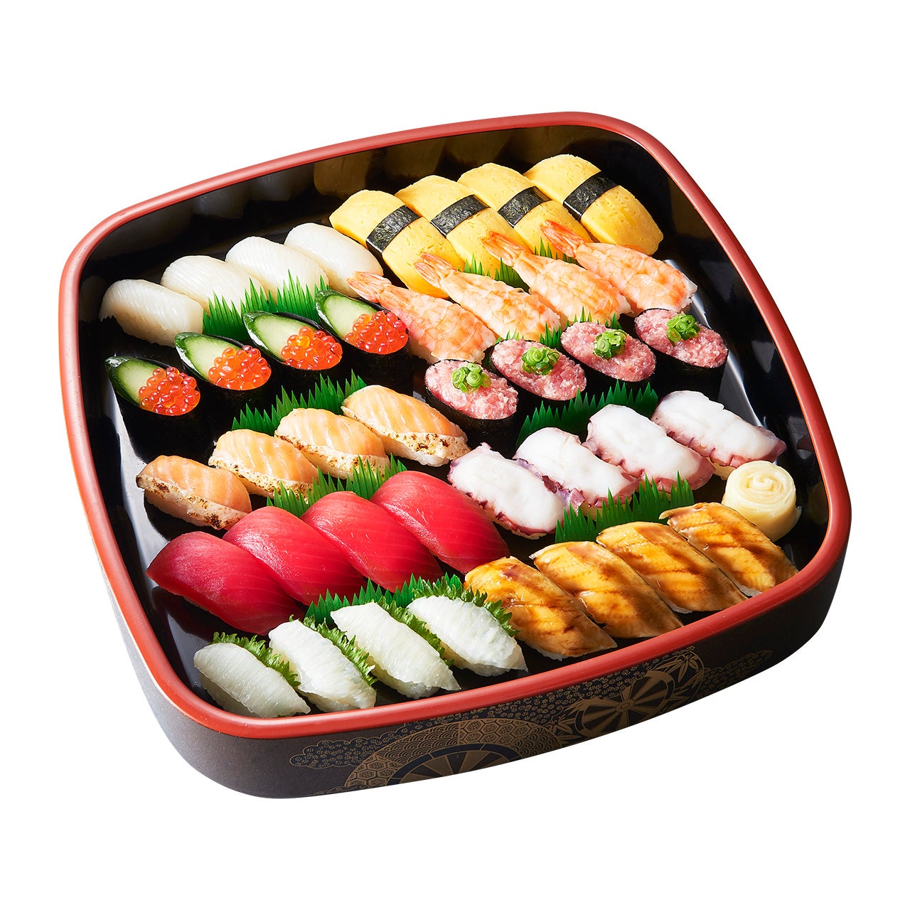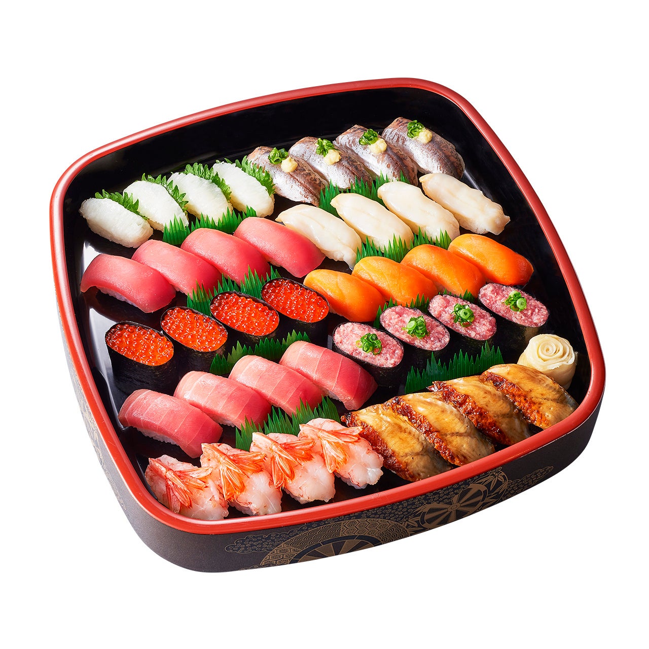 いか、玉子、いくら胡瓜、えび、焼サーモン、ねぎまぐろ軍艦、まぐろ、たこ、えんがわ、あなご