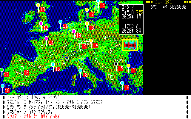 実際のプレイは、毎月コマンドを入力して進行。ホテル建設、シェフやマネージャーの雇用、ホテルの売買、株の売買、銀行からの融資といった、いかにもなコマンドが多数用意されており、これらを駆使して一大ホテルグループを目指します。また年ごとに景気が変動したり、月ごとにイベントやハプニングなども発生したりするため、ホテル経営はひと筋縄にはいきません。