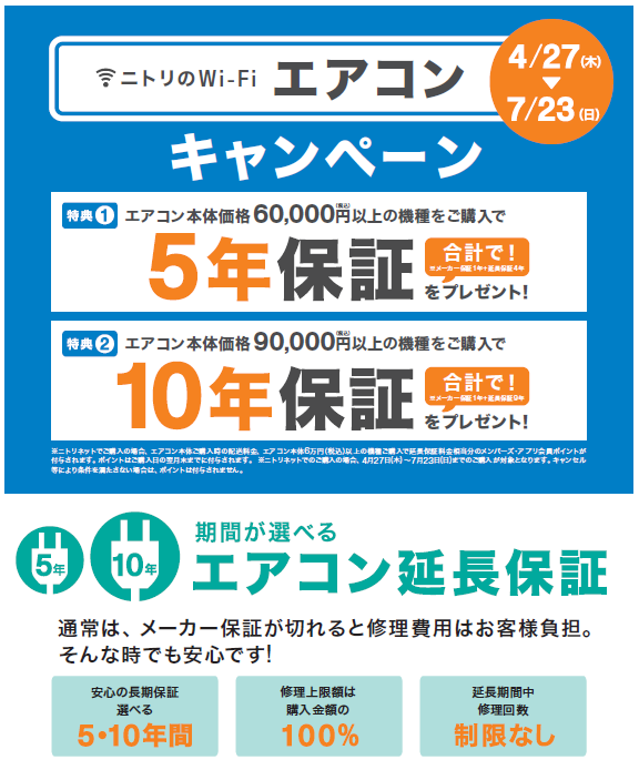 期間中、店頭にて本体価格60,000円(税込)以上の機種をご購⼊いただくと、5年保証(メーカー保証1年+延⻑保証4年)をプレゼント。本体価格90,000円(税込)以上の機種をご購⼊いただくと、10年保証(メーカー保証1年+延⻑保証9年)をプレゼントいたします。 ニトリネットでご購⼊の場合は、延⻑保証料⾦相当分のメンバーズ・アプリ会員ポイントを付与いたします。