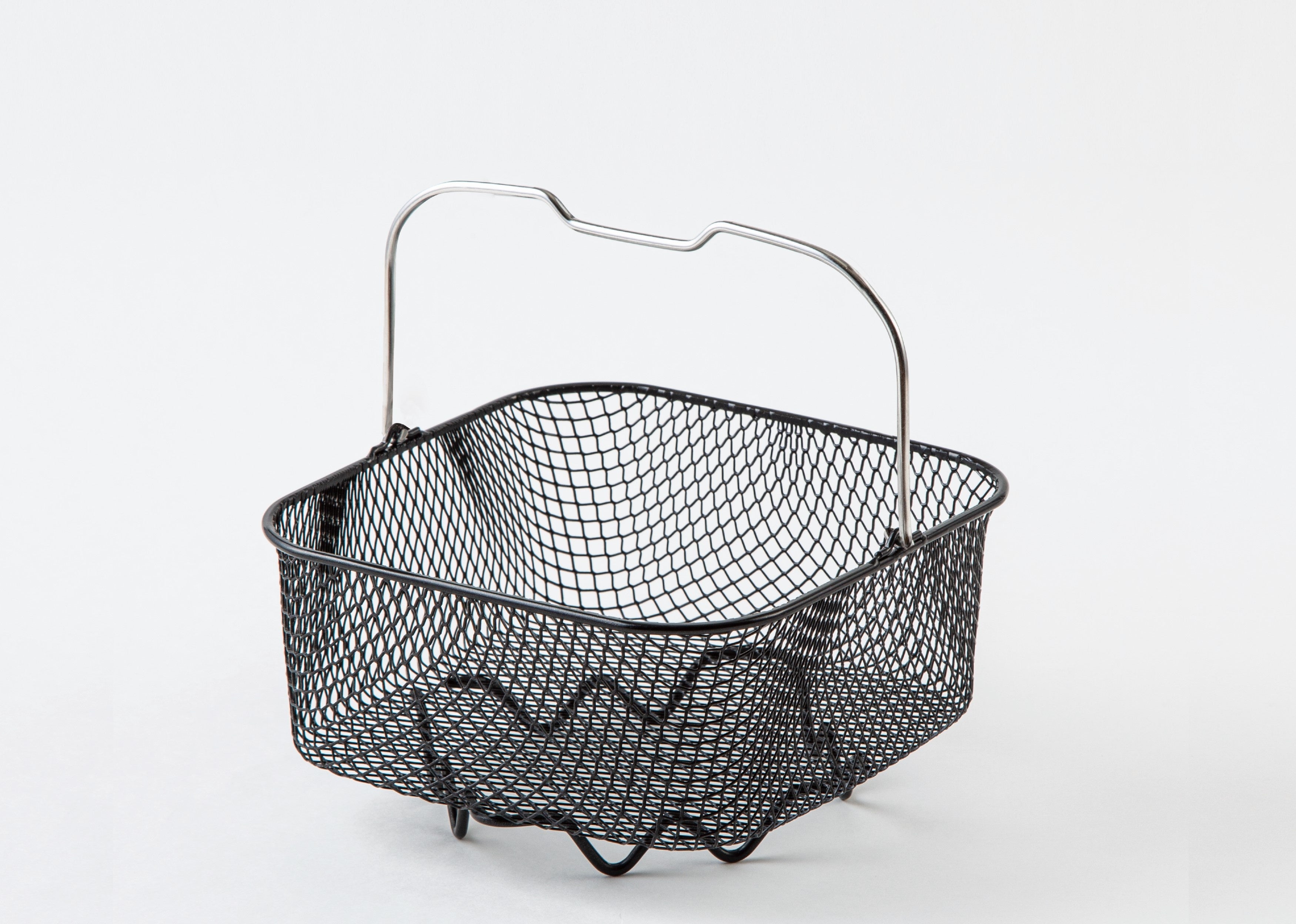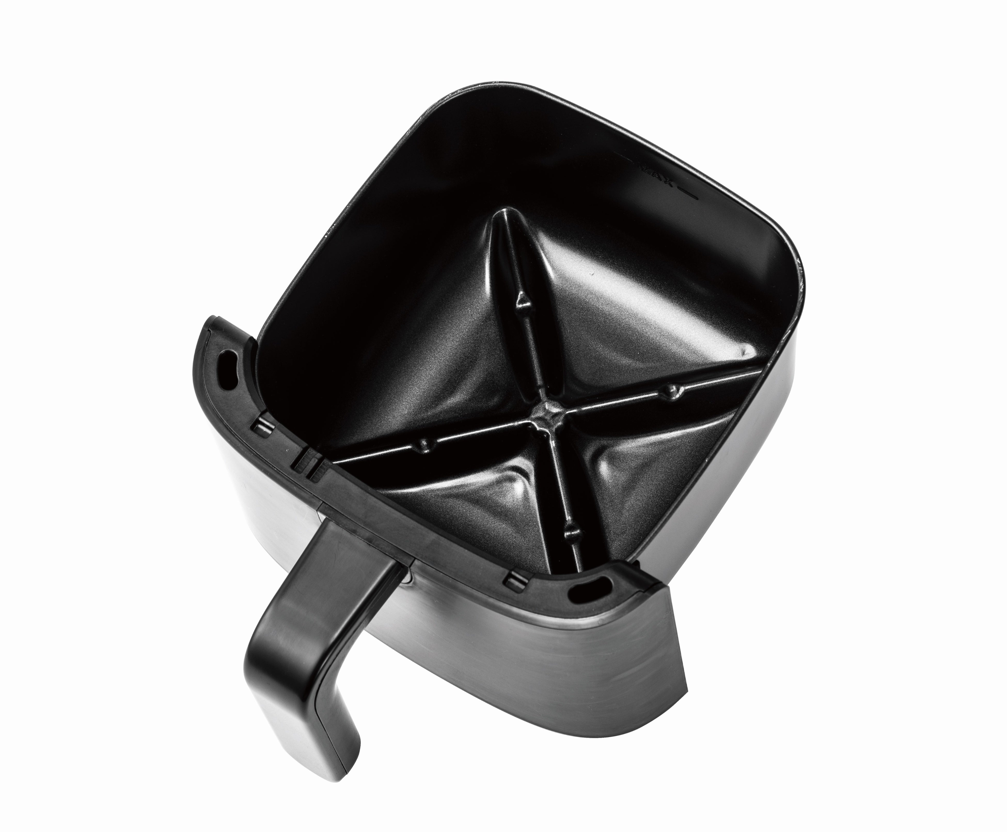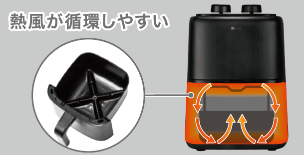 トレイの底には「×型」の凹凸があり、熱風が下側にもまわりやすい構造です。また、網目のバスケットが付いており、上下から熱を通しやすく、混ぜなくても均等に焼き上げることができます(※)。食品全体に効率よく熱風があたるので、熱々でカリッとした食感に仕上がります。(※食材や調理量などにより変わります)