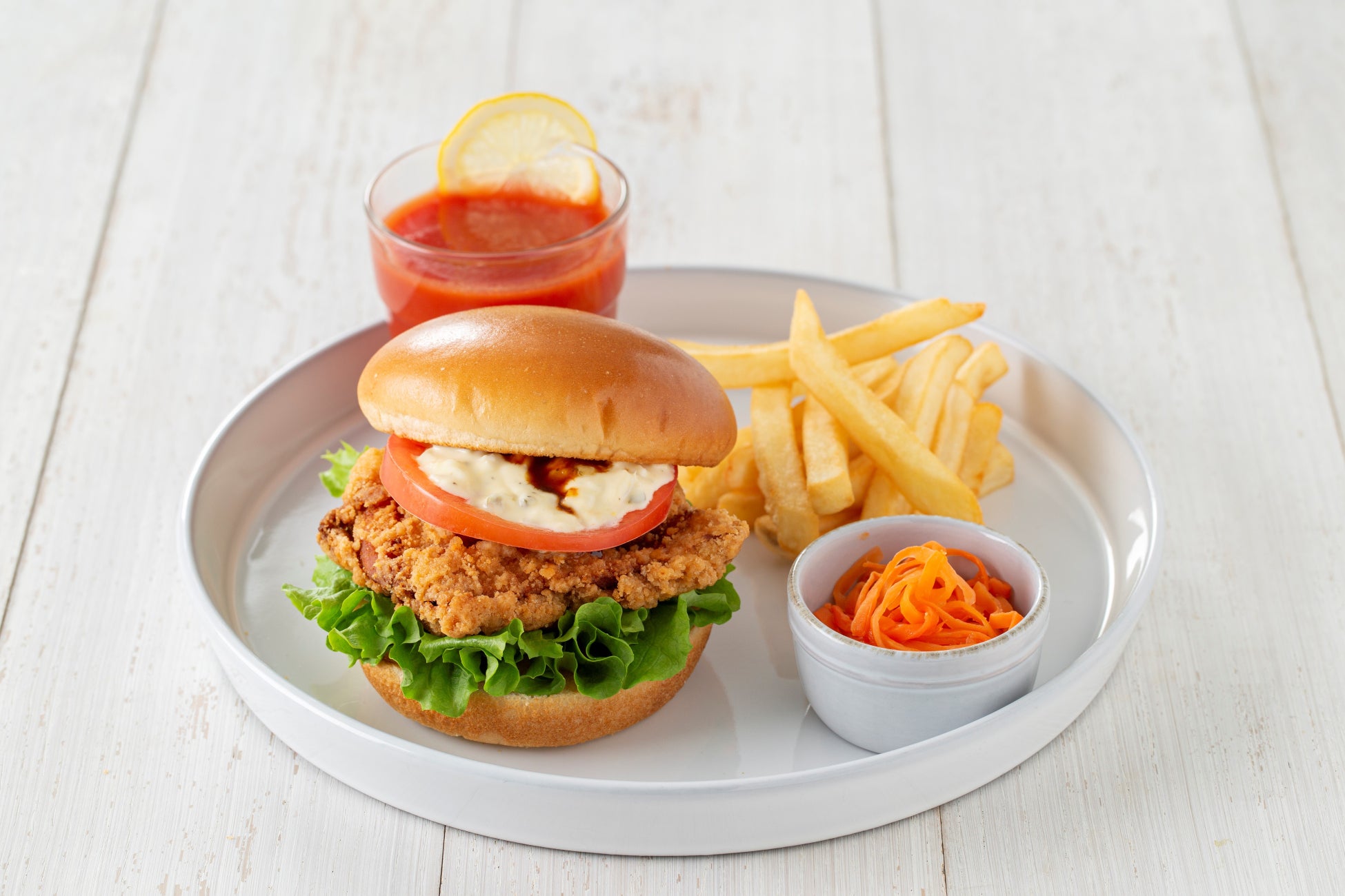 商品ラインアップには、駅前の店舗という立地を考慮して、モーニングからディナータイムまで幅広い時間での利用を想定したメニューを取り揃えました。モスチキンを使用した「モスチキン・バーガー」や、1号店のある静岡県の伊豆天城名産であるわさびを使用した「わさびバーガー」などのバーガーメニューを中心に、ピザなどの軽食やスイーツ、アルコールメニューなど様々なシーンでご利用いただけるような商品をご提供します。こだわりのドリンクでは、「自家製レモネードソーダ」などフルーツを贅沢に使用したお飲み物をお楽しみいただけます。