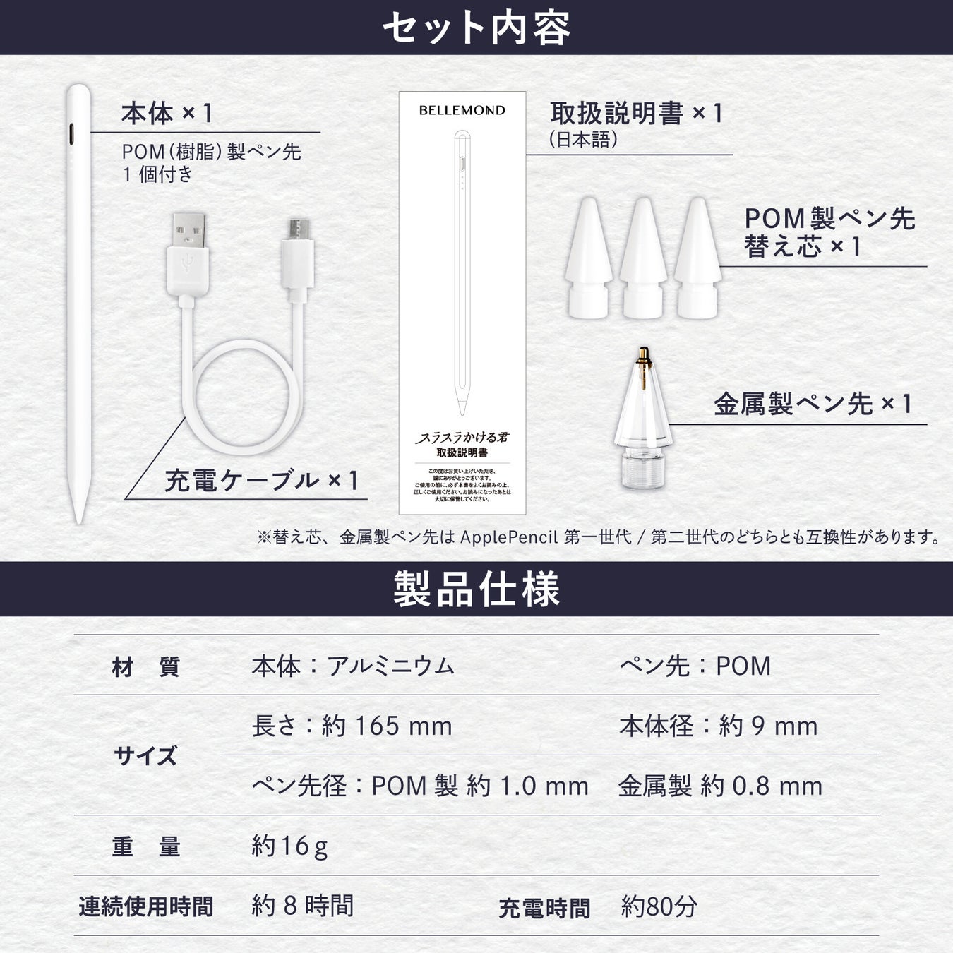 セット内容:スタイラスペン本体、交換用ペン先(樹脂製×3、金属製×1)、充電用USB-Cケーブル、取扱説明書