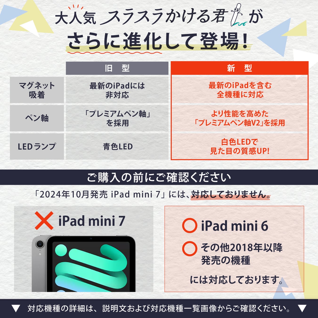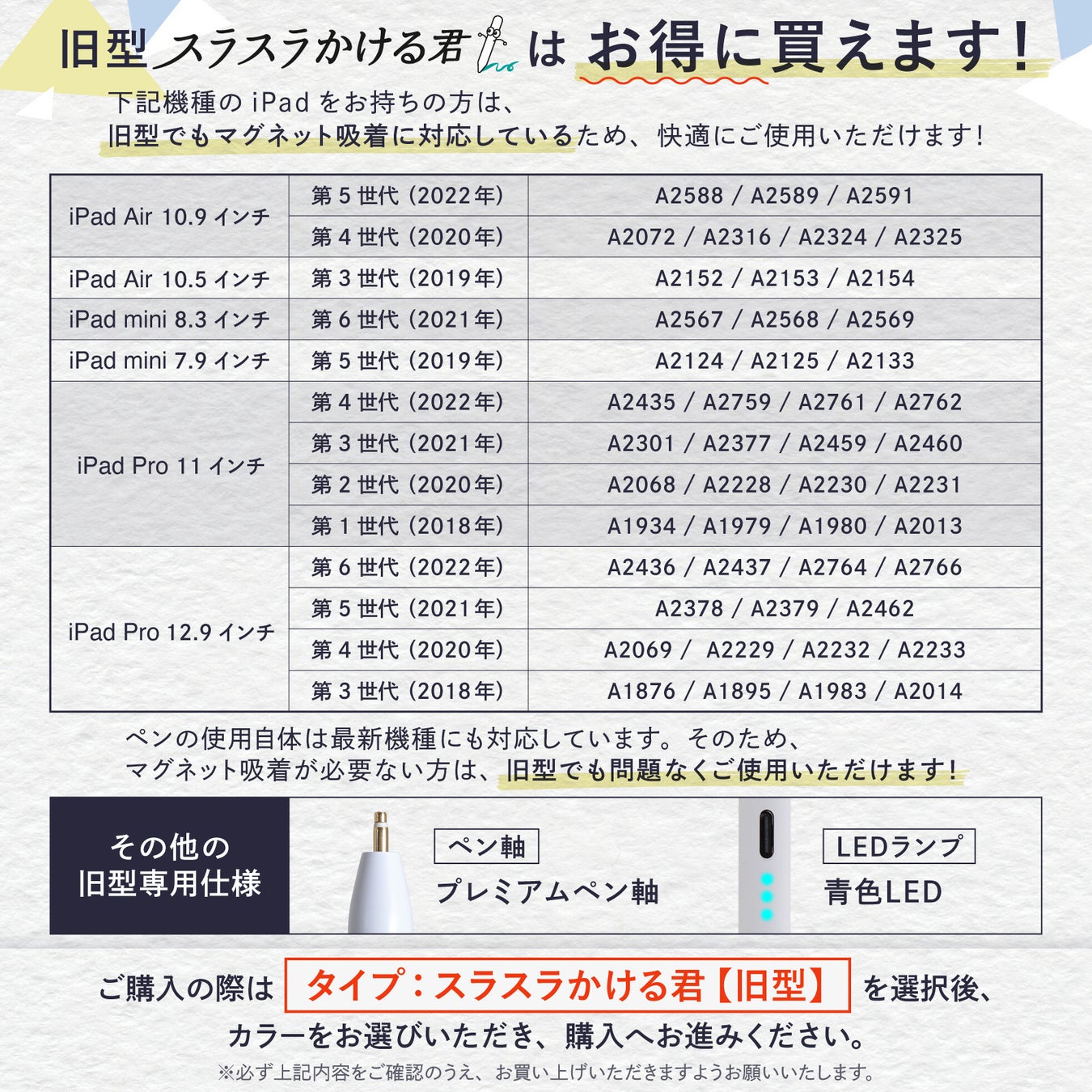 新型「スラスラかける君」は、以下の2024年以降に発売されたiPadモデルでのマグネット吸着機能に対応しています。これにより、iPad側面に直接装着可能となり、持ち運びや収納がより便利になりました。