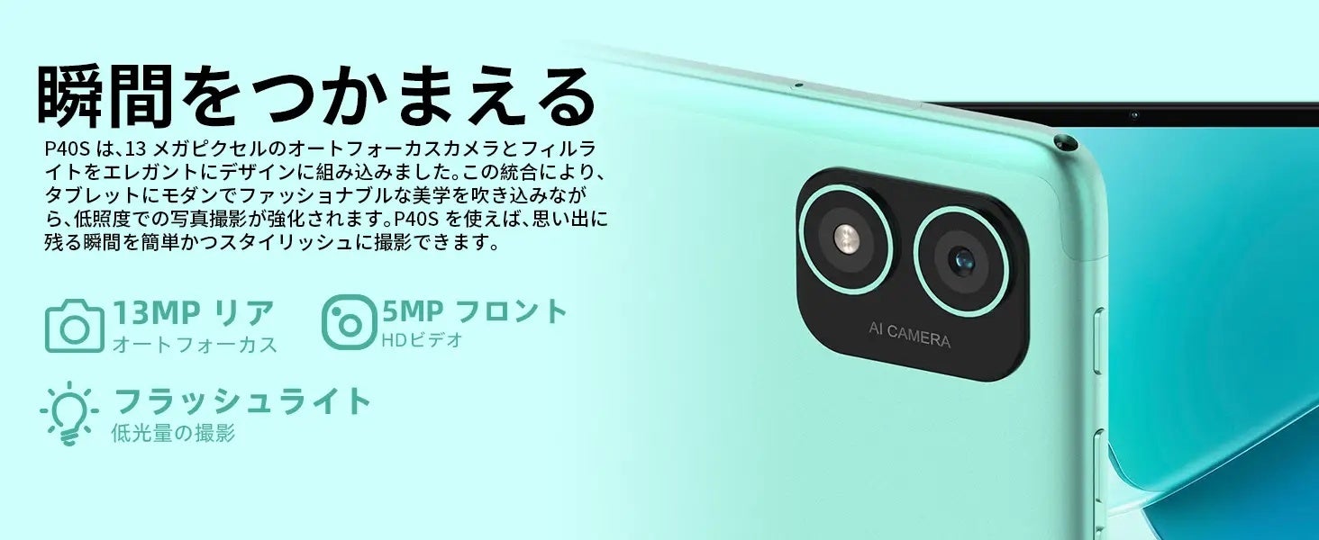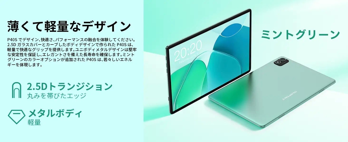 P40Sは、10.1インチの高解像度大画面を備え、IPSテクノロジーにより178°の超広視野角を実現します。1280×800の解像度は、鮮明さと消費電力のバランスを実現し、16:10の黄金比とT-Colour 2.0色最適化により、より没入する視聴体験を提供します。2.5Dガラスカバーとカーブしたボディデザインで作られたP40S は、軽量で快適なグリップを提供します。ミントグリーンのカラーオプションが追加され、若々しいエネルギーを体現します。