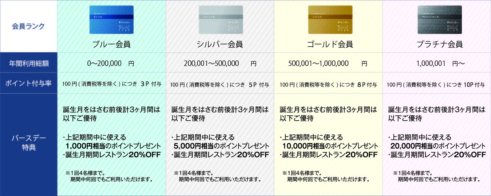 年間(毎年4月~翌3月まで)のご利用総額に応じて翌年の会員ランクが決定。