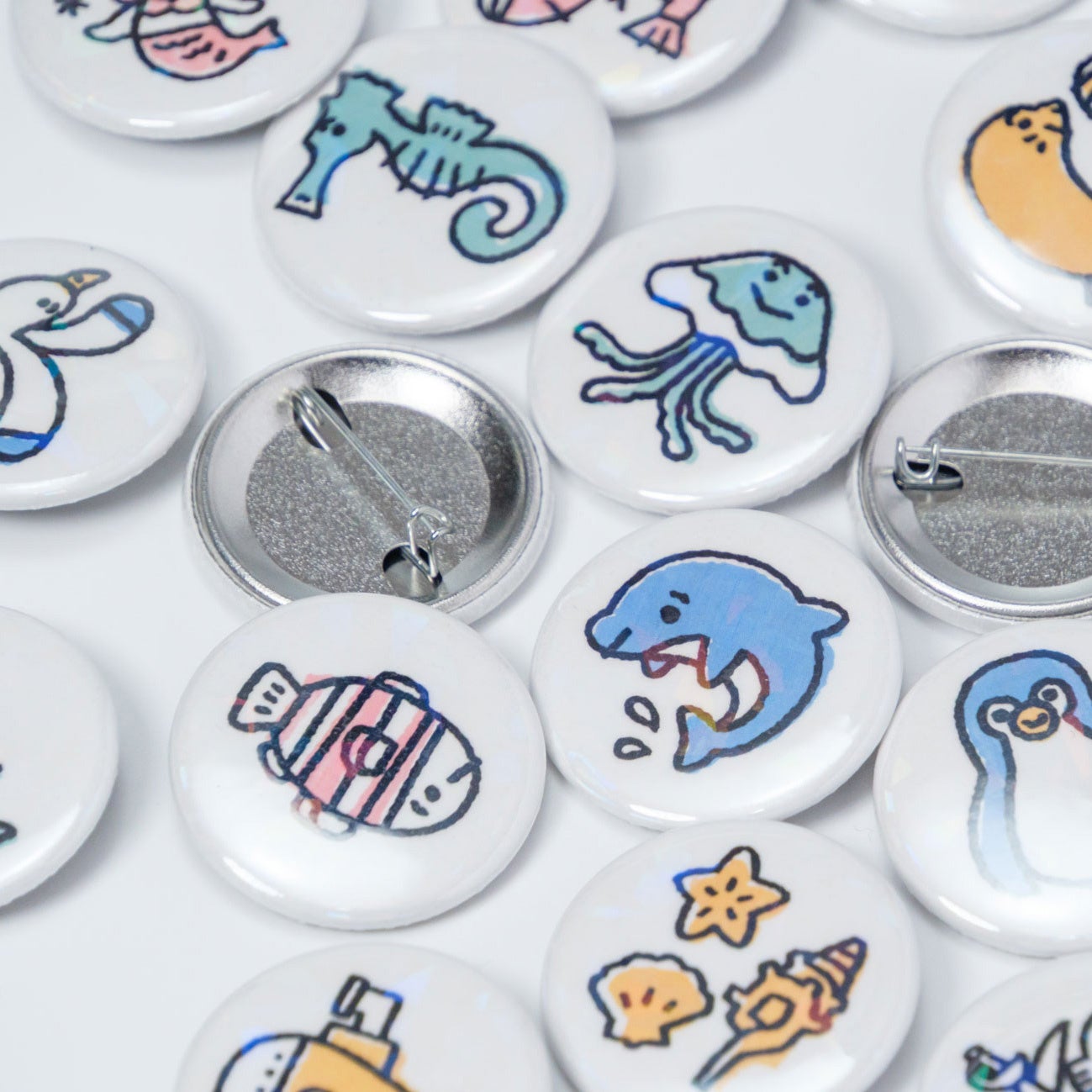 「可愛くてカラフルな海洋生物をもっと身近に」をコンセプトにイルカやクジラ、サメ、深海魚な ど、海で暮らすいきものたちをカラフルでやさしいタッチで描いています。