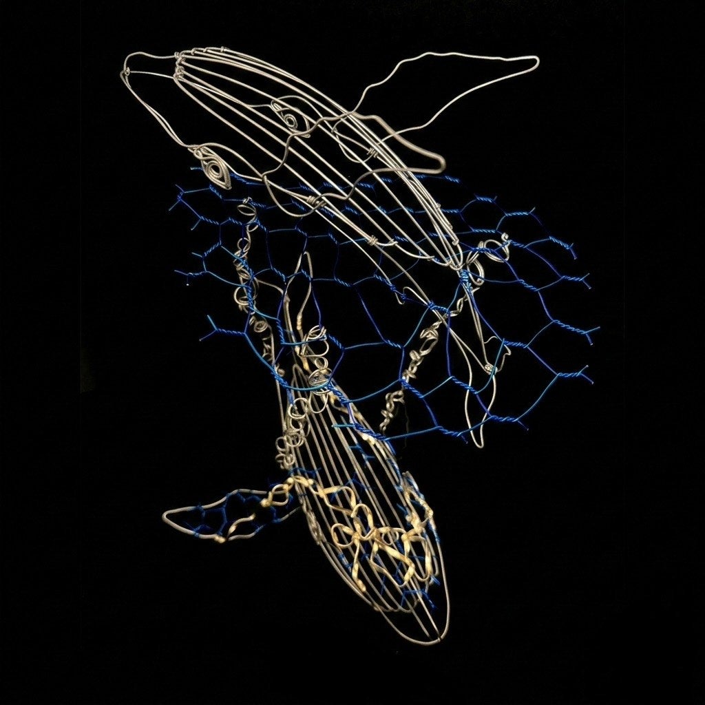 一本の針金を丁寧に曲げて、クジラや生き物の立体作品を制作しています。光を当てると針金の隙間から美しい影の線が浮かび上がり、作品がもう一つの表情を見せ始めます。光と影を針金の線が紡ぐ幻想的な世界を通じて、ささやかな感動をお届けできれば嬉しいです。