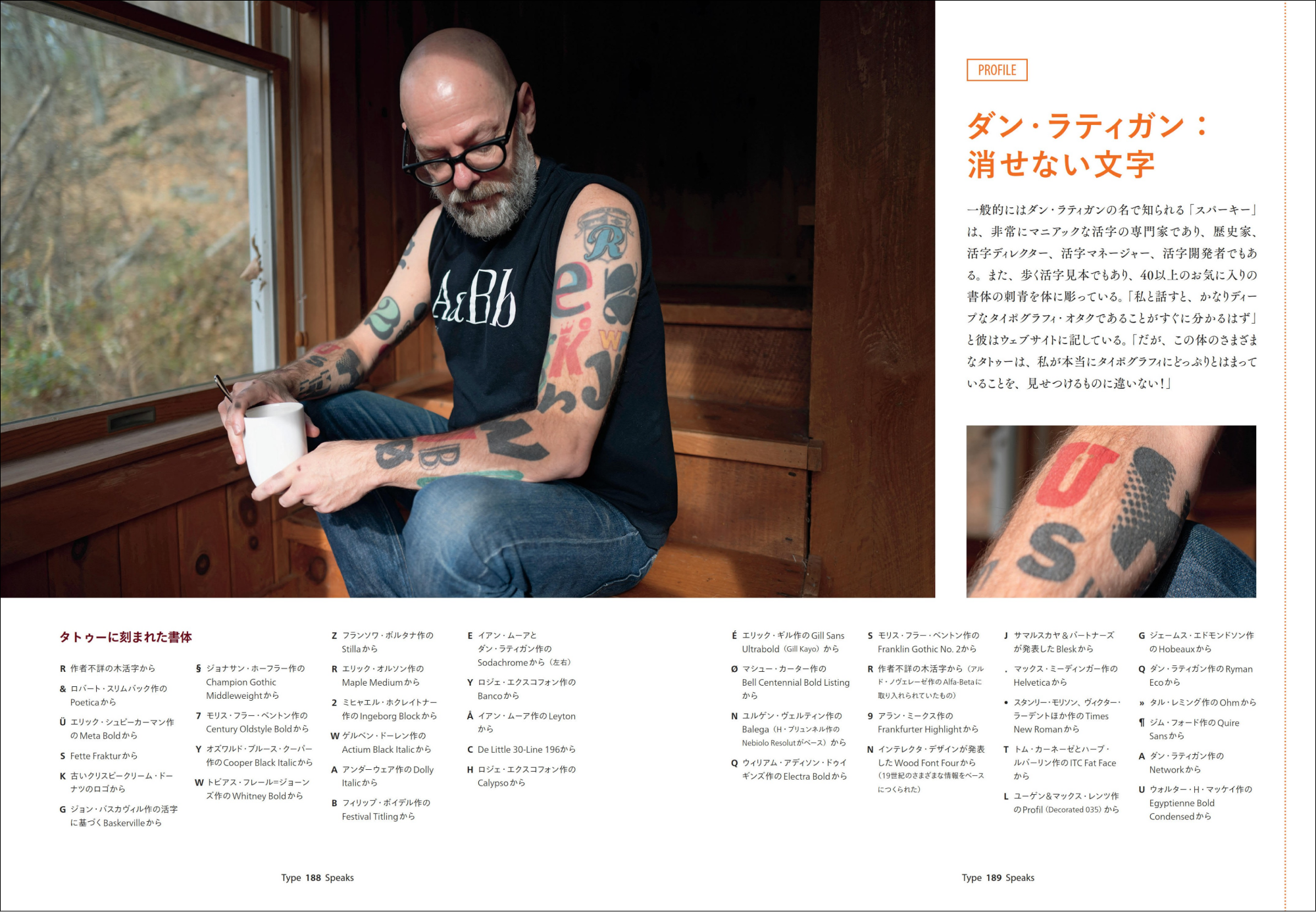 ダン・ラティガンは非常にマニアックな活字の専門家であり、歴史家、活字ディレクター、活字マネージャー、活字開発者でもある。また、歩く活字見本でもあり、40以上のお気に入りの書体の刺青を体に彫っている。「私と話すと、かなりディープなタイポグラフィ・オタクであることがすぐに分かるはず」と彼は記している。