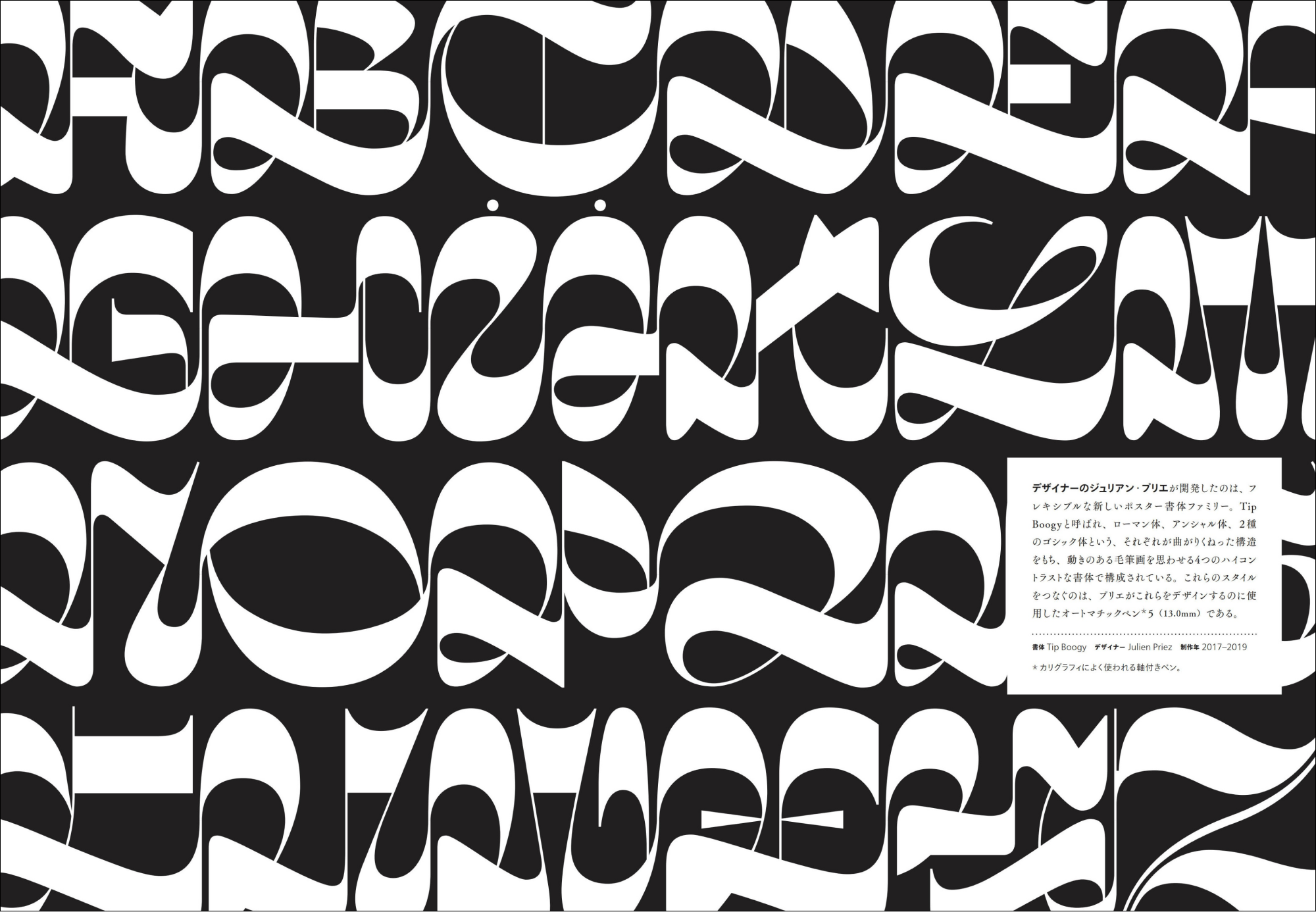 デザイナーのジュリアン・プリエが開発したのは、フレキシブルな新しいポスター書体ファミリー。Tip Boogyと呼ばれ、ローマン体、アンシャル体、2種のゴシック体という、それぞれが曲がりくねった構造をもち、動きのある毛筆画を思わせる4つのハイコントラストな書体で構成されている。