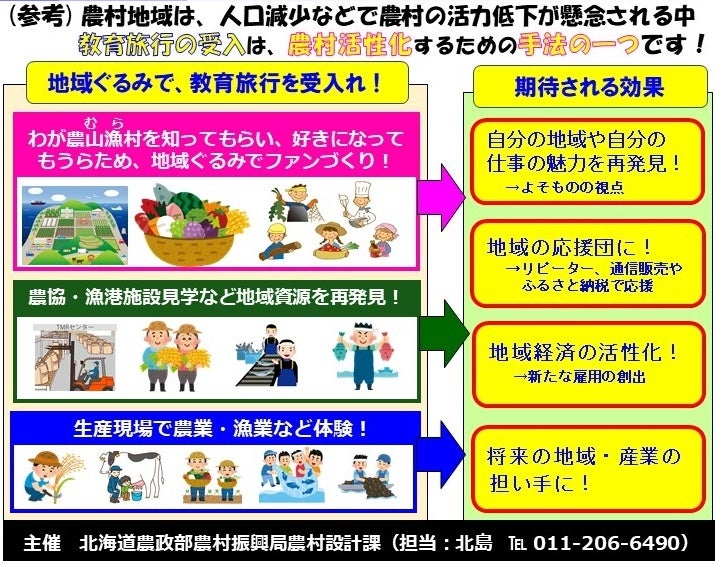北海道では、都市と農村の交流を通して、農村地域の理解促進と関係人口の増加を図るため、教育旅行の受入を推進していますが、新型コロナウイルス感染症まん延の影響を受け、意欲低下による受入農林漁業者等の減少や、それに伴う受入キャパシティの不足が課題となっています。