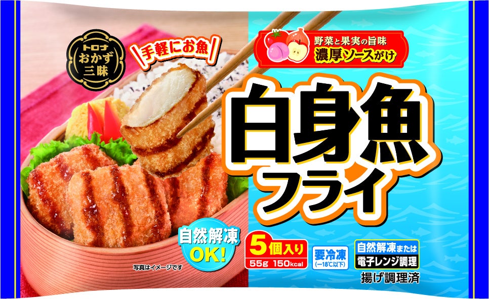 身がふっくらした白身魚フライに野菜と果実の旨みが詰まった濃厚ソースをかけました。お弁当のすき間に丁度よいサイズの一品です。自然解凍でもお召し上がりいただけます。