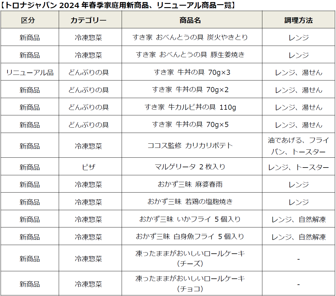 【トロナジャパン】~トロナジャパン2024年春季家庭用冷凍食品~ 新商品・リニューアル商品のご案内 「すき家 おべんとうの具」シリーズが新登場 紙カップ入りでお弁当箱にそのまま詰められる!